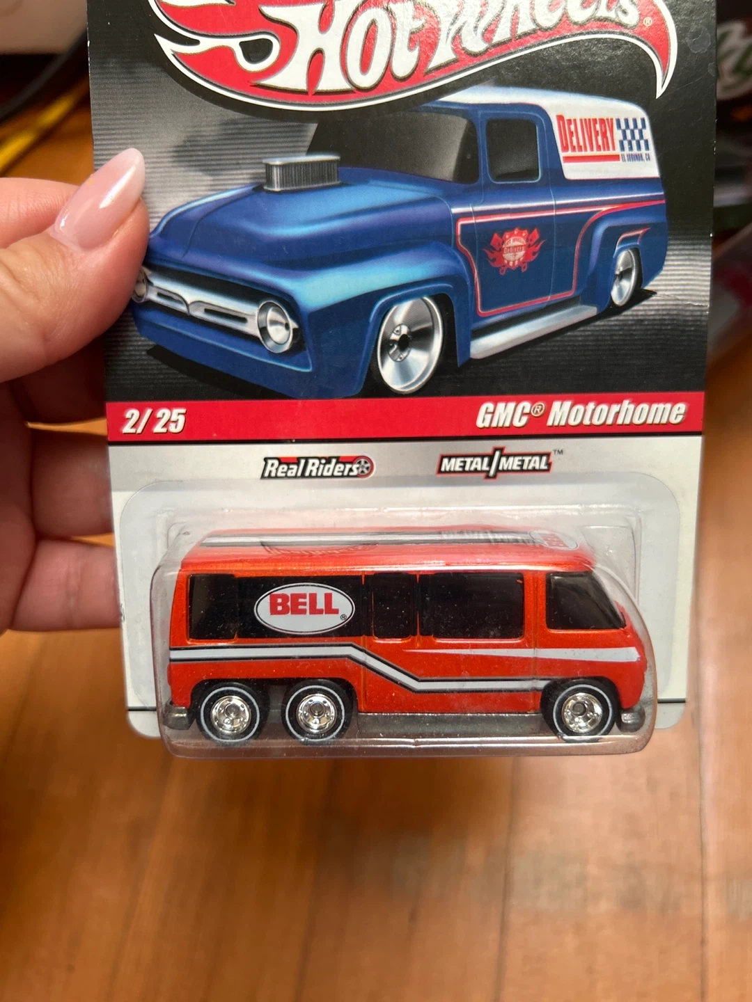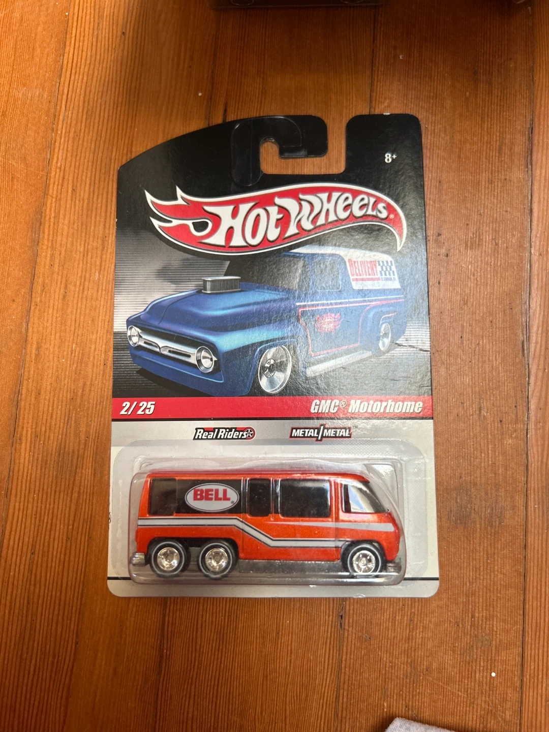 This is a Hot Wheels GMC Motorhome diecast vehicle. It's part of the Real Riders collection and features 'Metal Metal' construction. The vehicle is orange with a Bell logo.