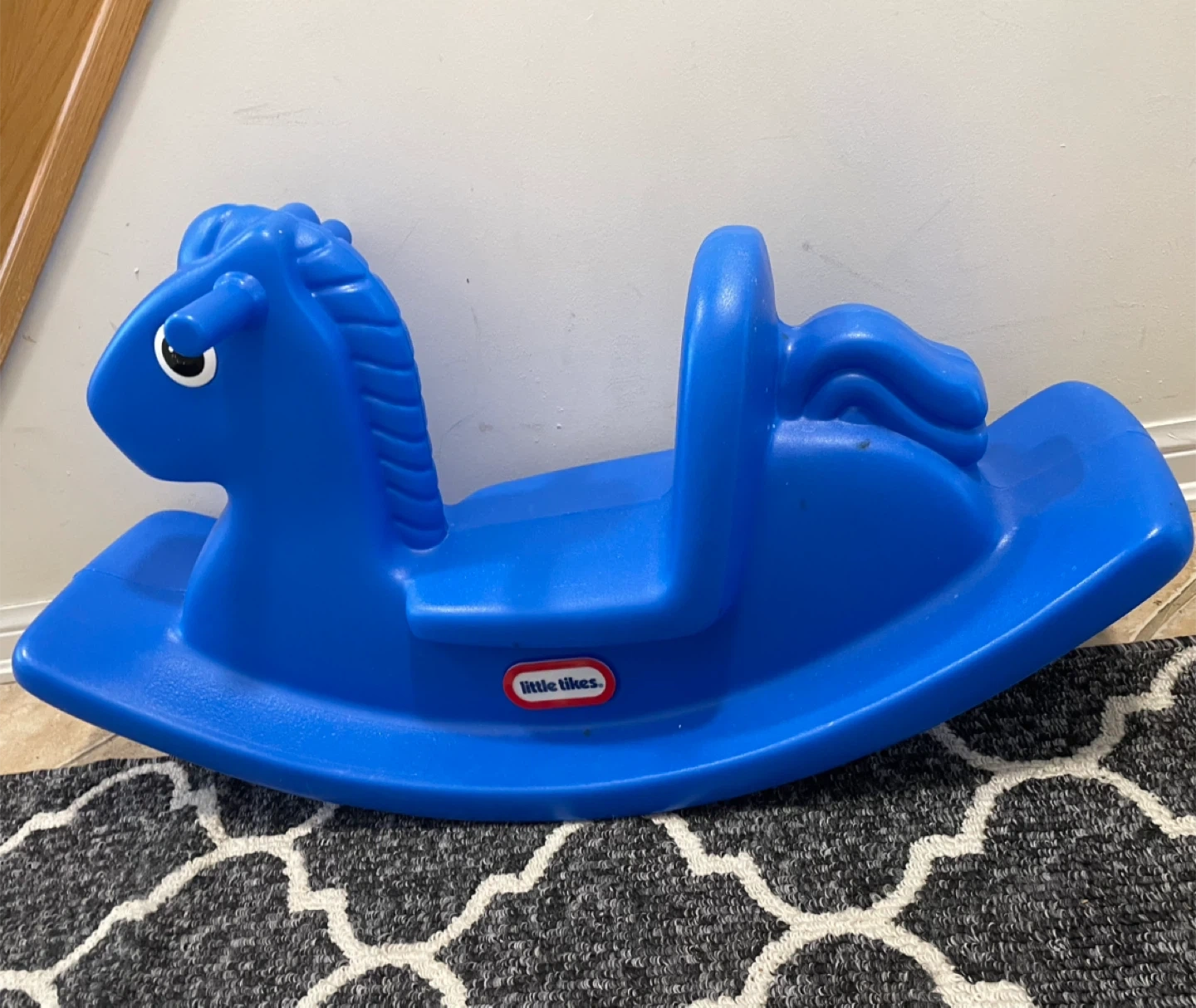 It's a classic blue rocking horse by Little Tikes. Made of durable plastic, it's designed for safe and fun play. This rocking toy is great for toddlers and young children to enjoy indoors or outdoors.