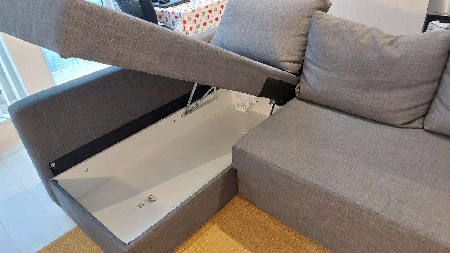 I'm selling this grey sectional sofa bed, because of moving out. It offers comfortable seating and hidden storage for extra pillows and duvets.