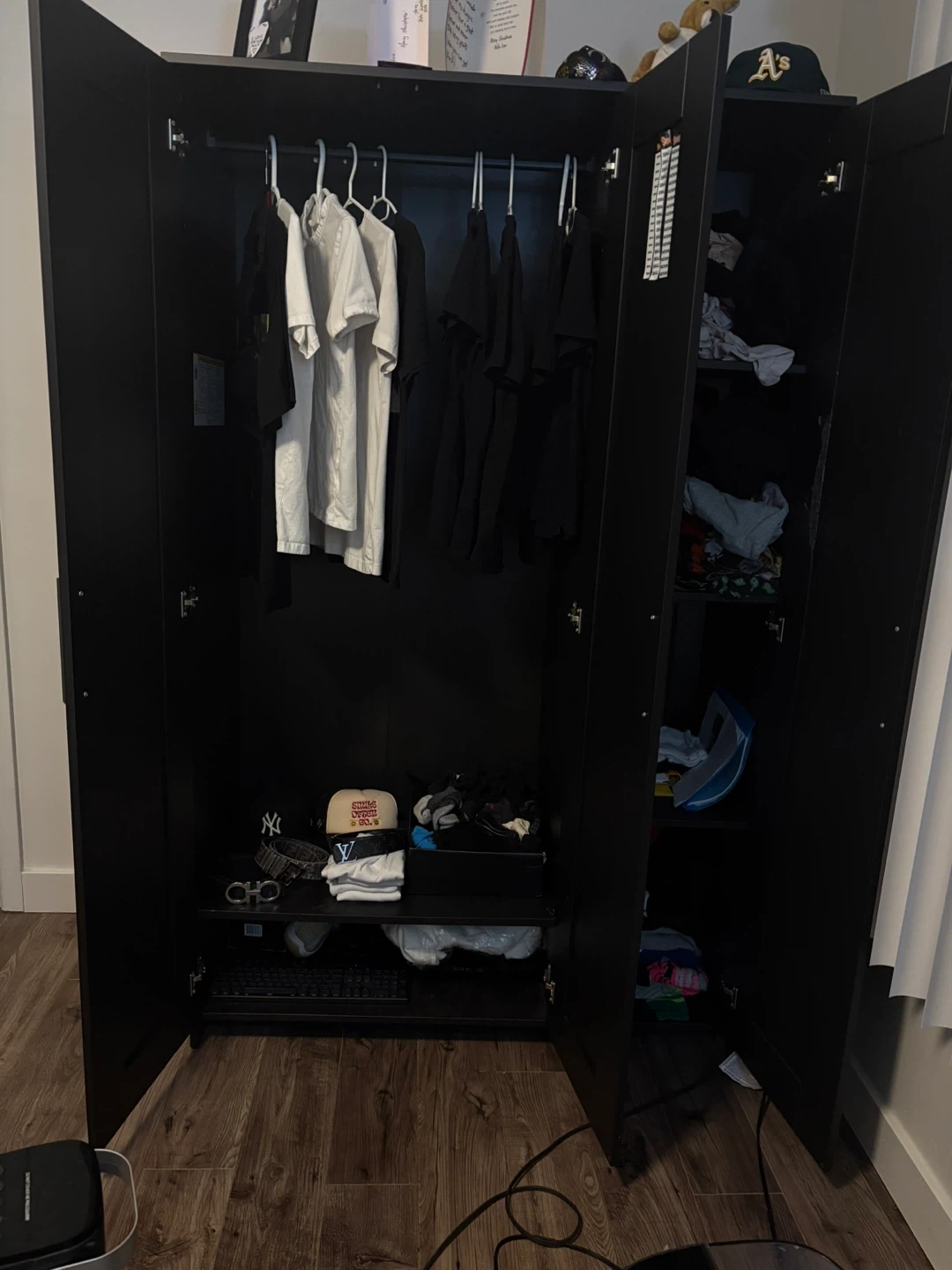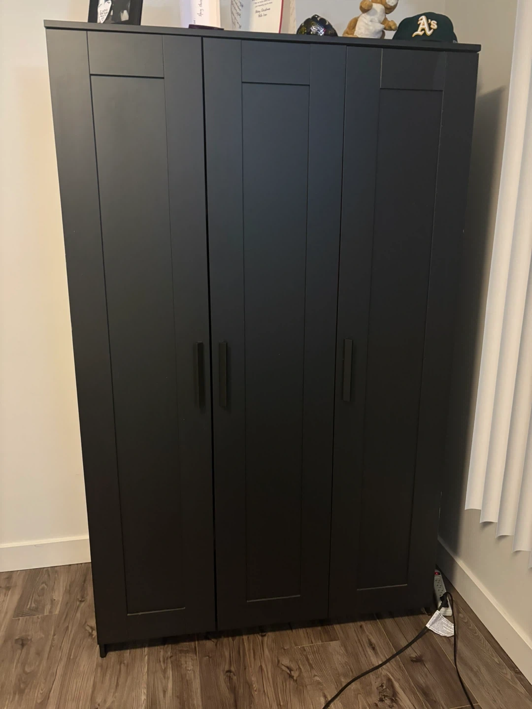 A spacious black wardrobe with three doors, perfect for organizing clothes and accessories. It features hanging space and shelving inside. Great for bedrooms or entryways!