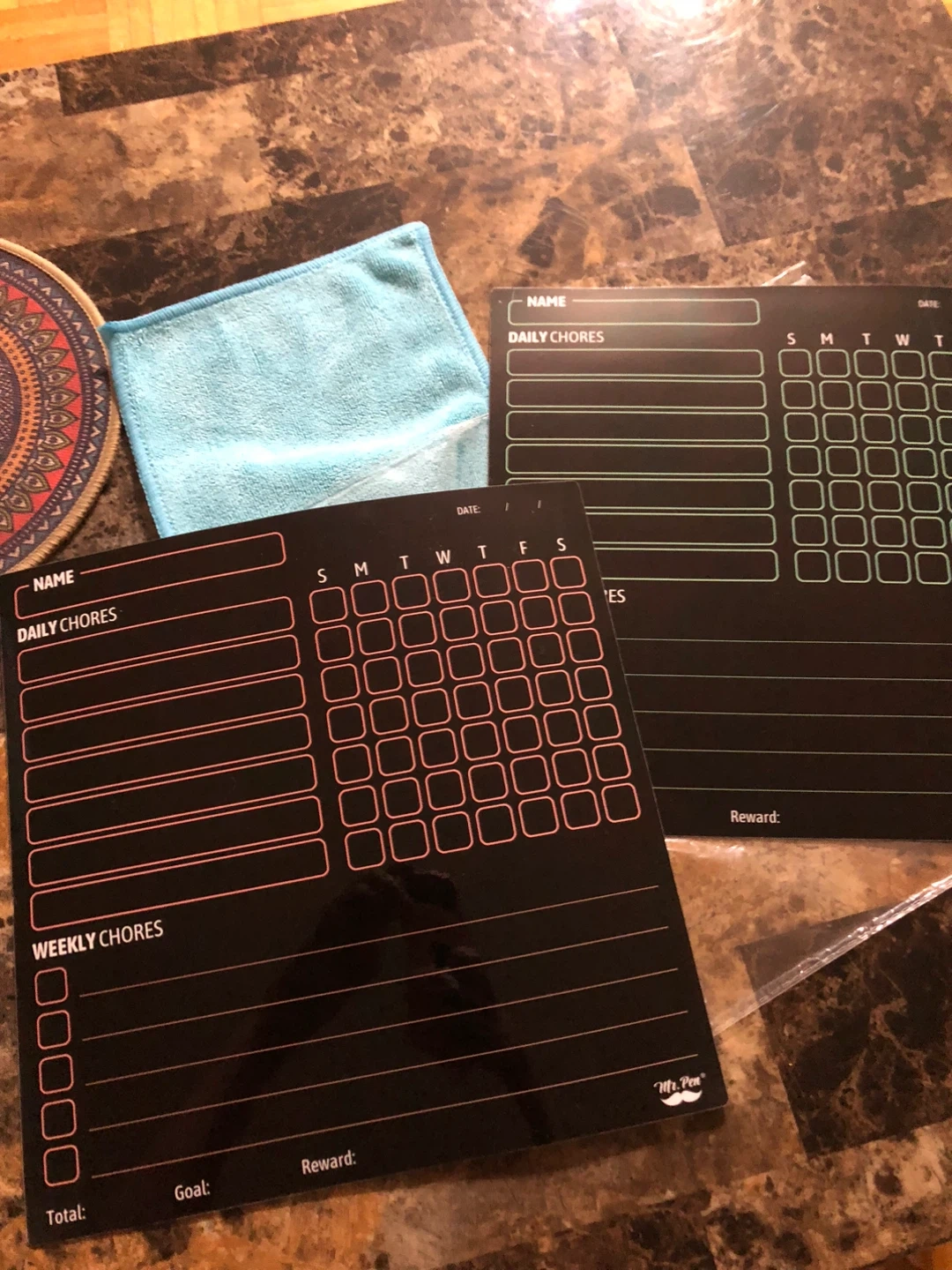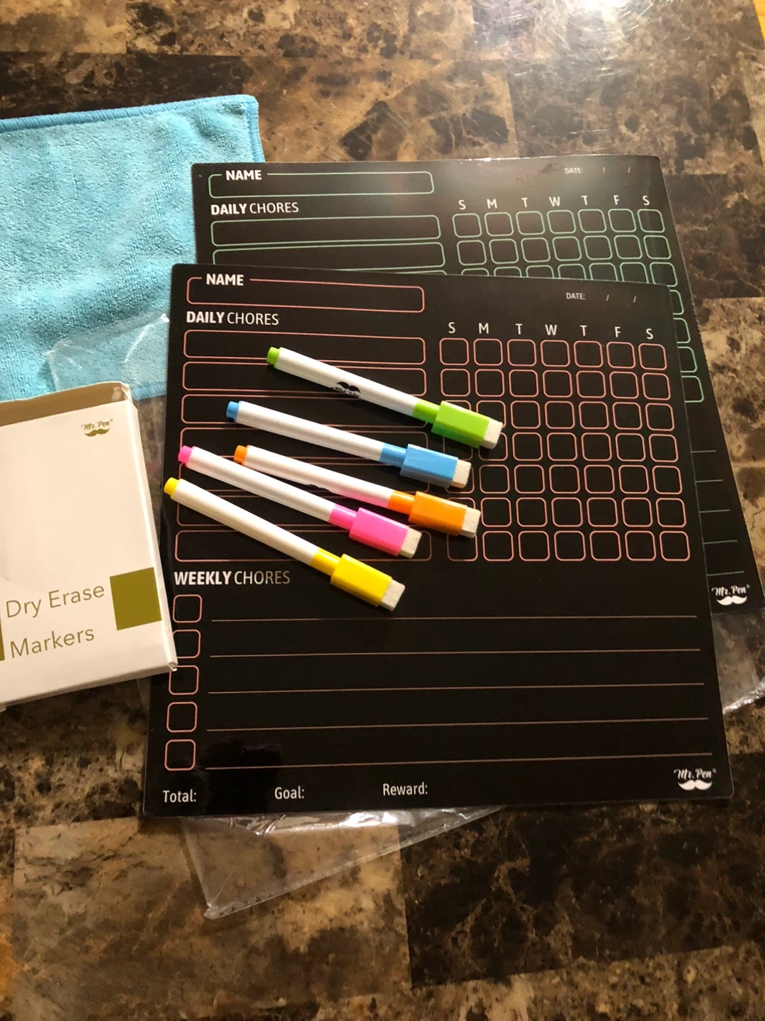 This Mr. Pen Dry Erase Chore Chart Set set includes two dry erase chore charts, one with green accents and one with pink accents. It also comes with a microfiber cloth and a pack of five dry erase markers in assorted colours. These charts are great for tracking daily and weekly chores.