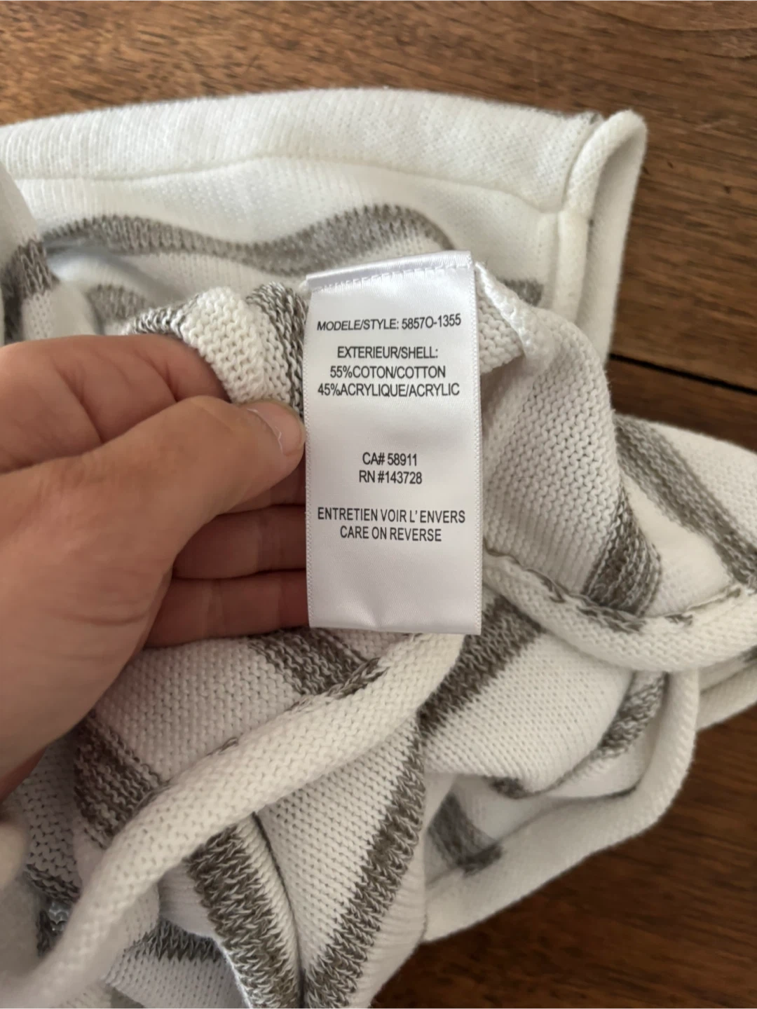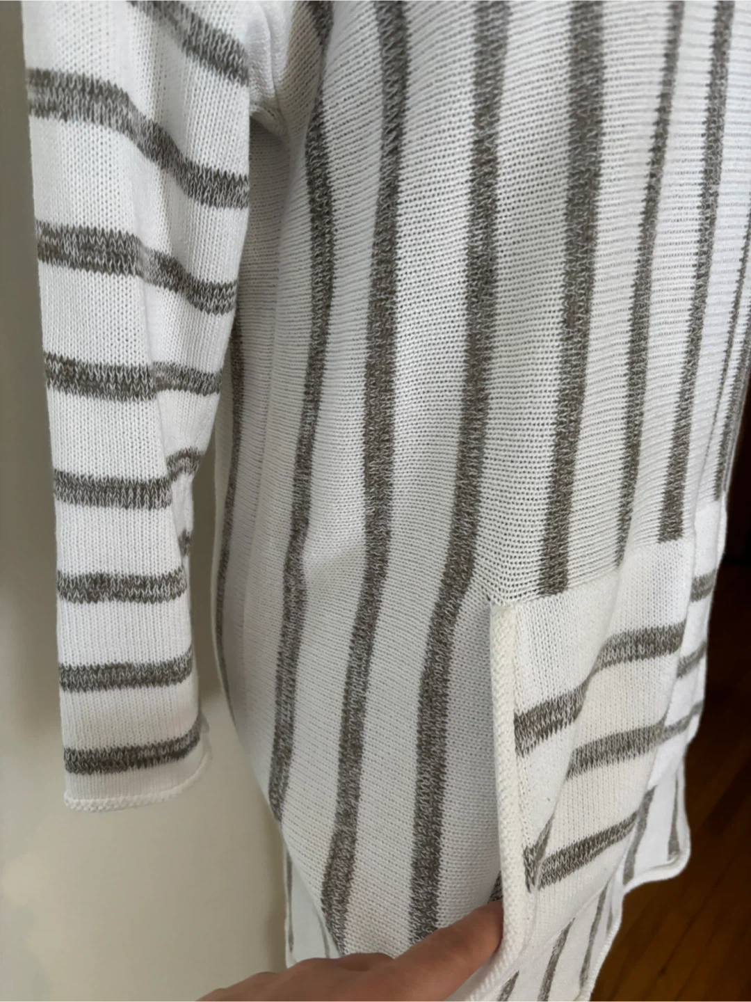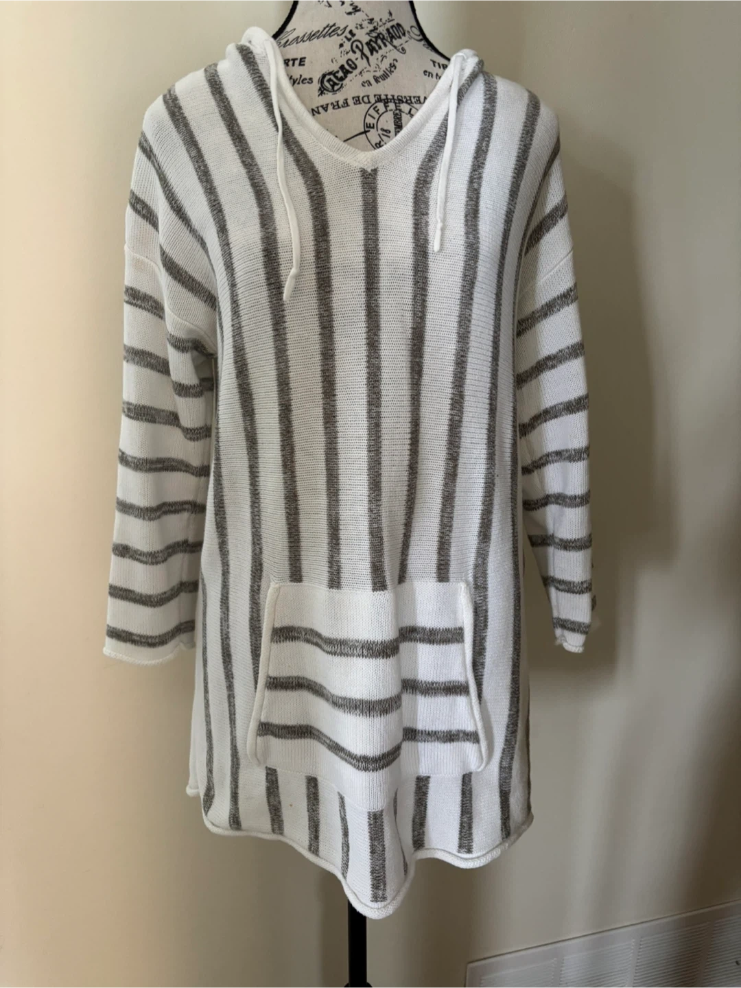 Lightweight hooded tunic sweater with a front pouch pocket. It's a white and grey striped knit with 3/4 sleeves. This piece offers a relaxed fit and comfortable feel. Size medium. In excellent condition. Cash only.