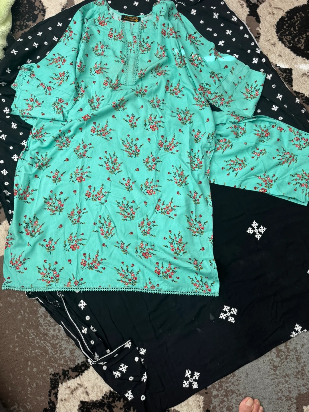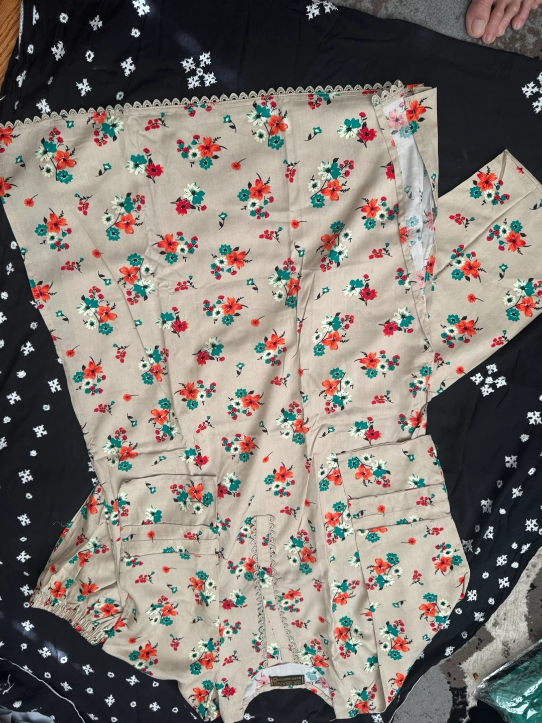 This is a women's suiteswith a beautiful floral print. It features a round neckline with a buttoned placket and decorative trim. The fabric is lightweight and breathable, suitable for warm weather.