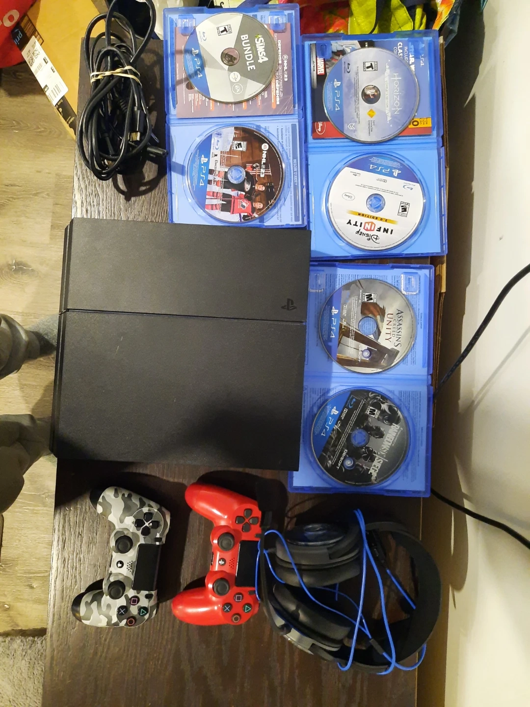 Includes a black PlayStation 4 console, two controllers, and several games like The Sims 4 Bundle, Horizon Zero Dawn, Disney Infinity, Assassin's Creed Unity, and Assassin's Creed Syndicate. Also comes with a headset and necessary cables. It's ready for gaming!