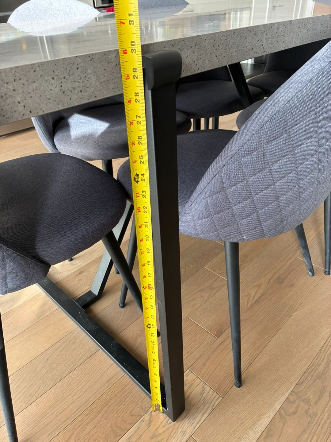 A modern dining set featuring a grey speckled tabletop and 6 matching grey upholstered chairs. The table has a durable metal base, and the chairs offer comfortable seating with their padded cushions and sleek design.