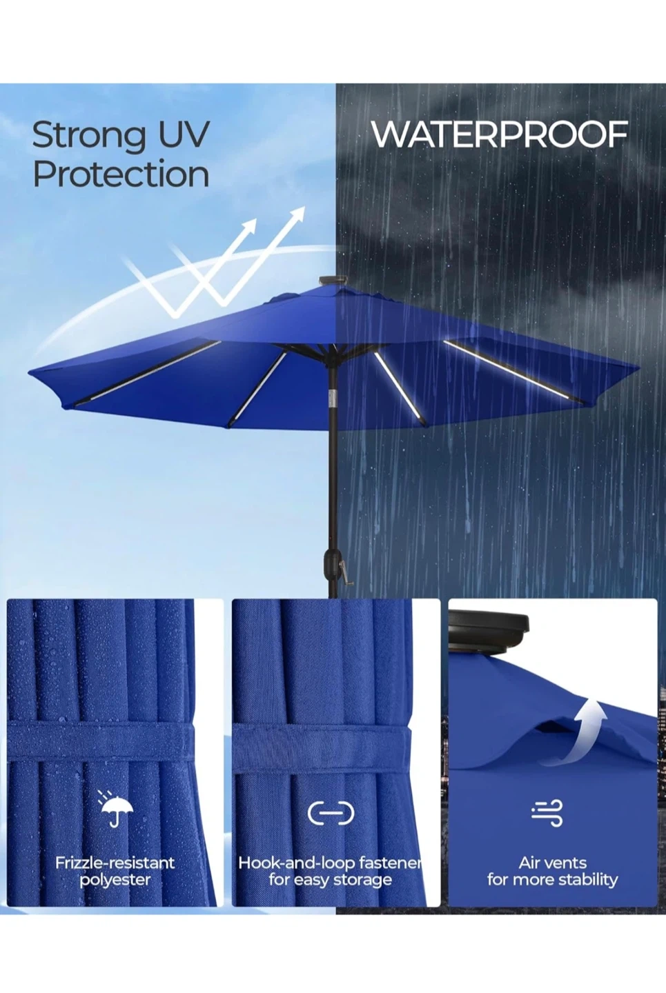 This 9ft patio umbrella features upgraded LED strip lights powered by a 2000mAh solar panel, providing up to 8 hours of light. It's made from frizz-resistant polyester and is waterproof with air vents for stability. Includes a hook-and-loop fastener for easy storage.