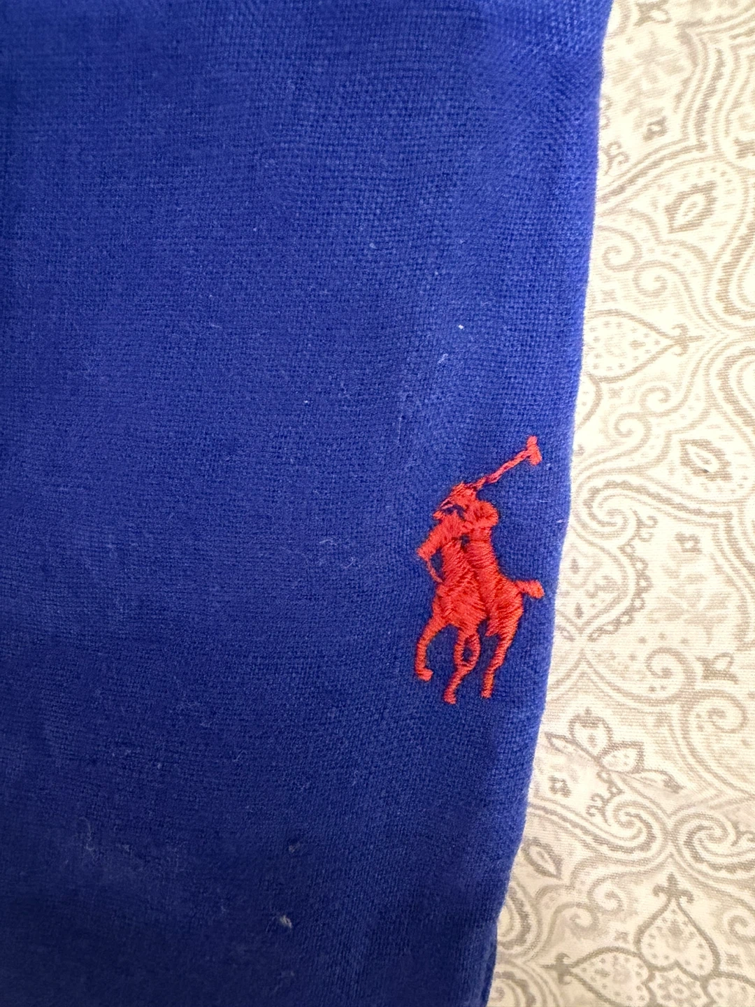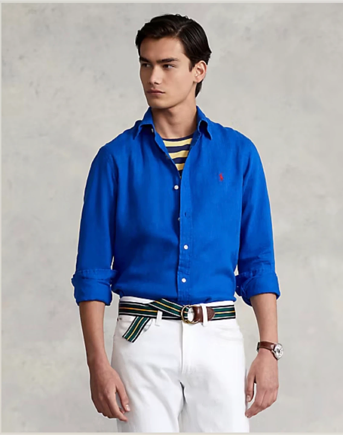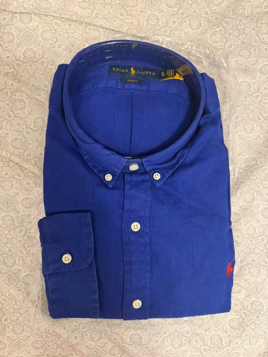 This is a Polo Ralph Lauren slim fit linen shirt in blue. It's size XL. Lightweight, breathable linen and a modern fit make this a warm-weather essential.