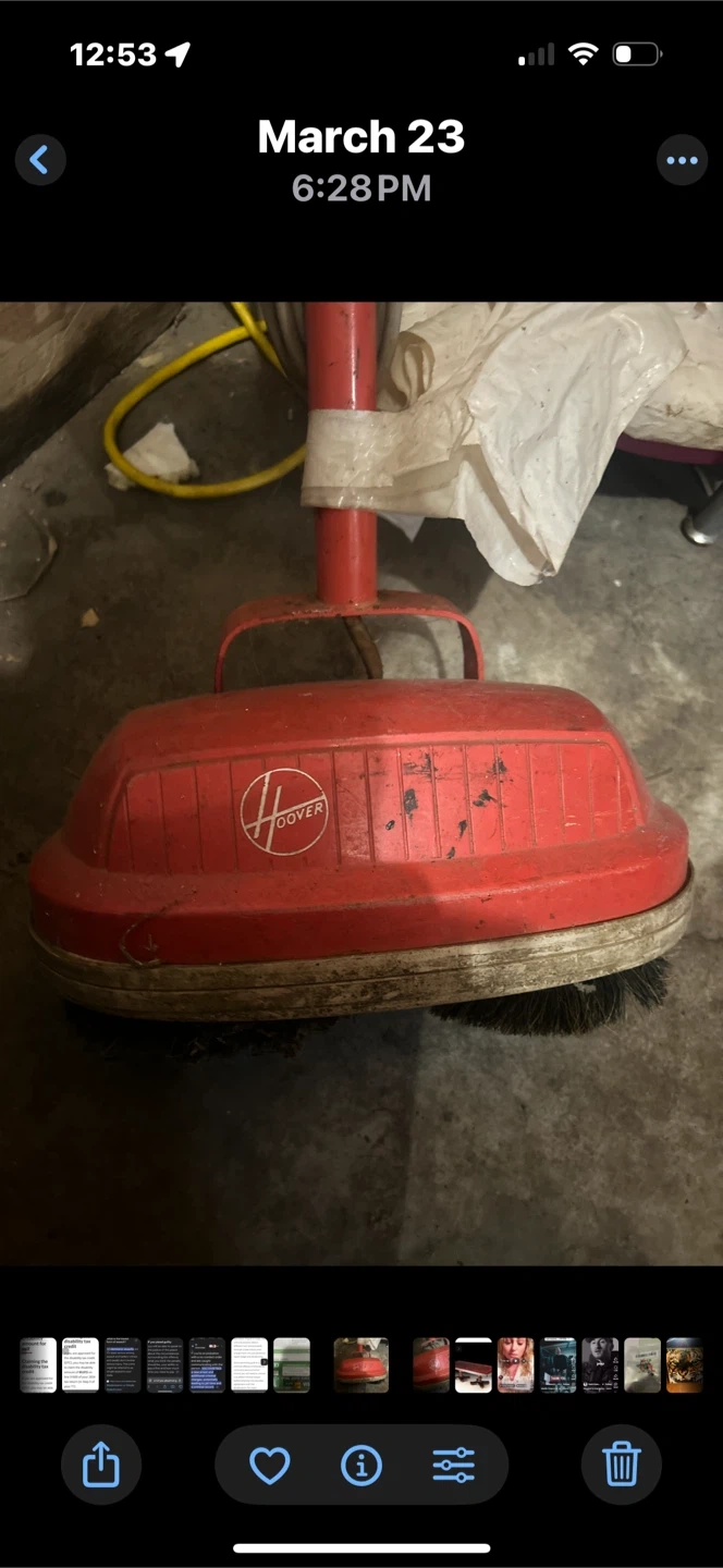 This is a vintage red Hoover floor scrubber. It has a rotating brushes for cleaning. This is useful for deep cleaning floors. Comes with buffer covers.
