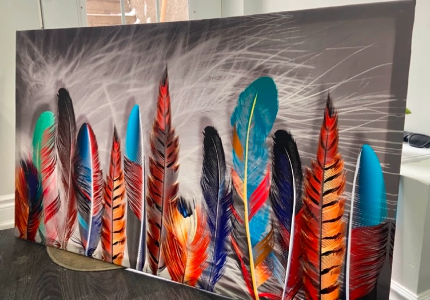 Vibrant canvas art featuring detailed feather and poppy designs. These prints add a splash of colour and artistry to any room. Each piece showcases intricate feather patterns and bold red poppies. It's ready to hang wall decor.