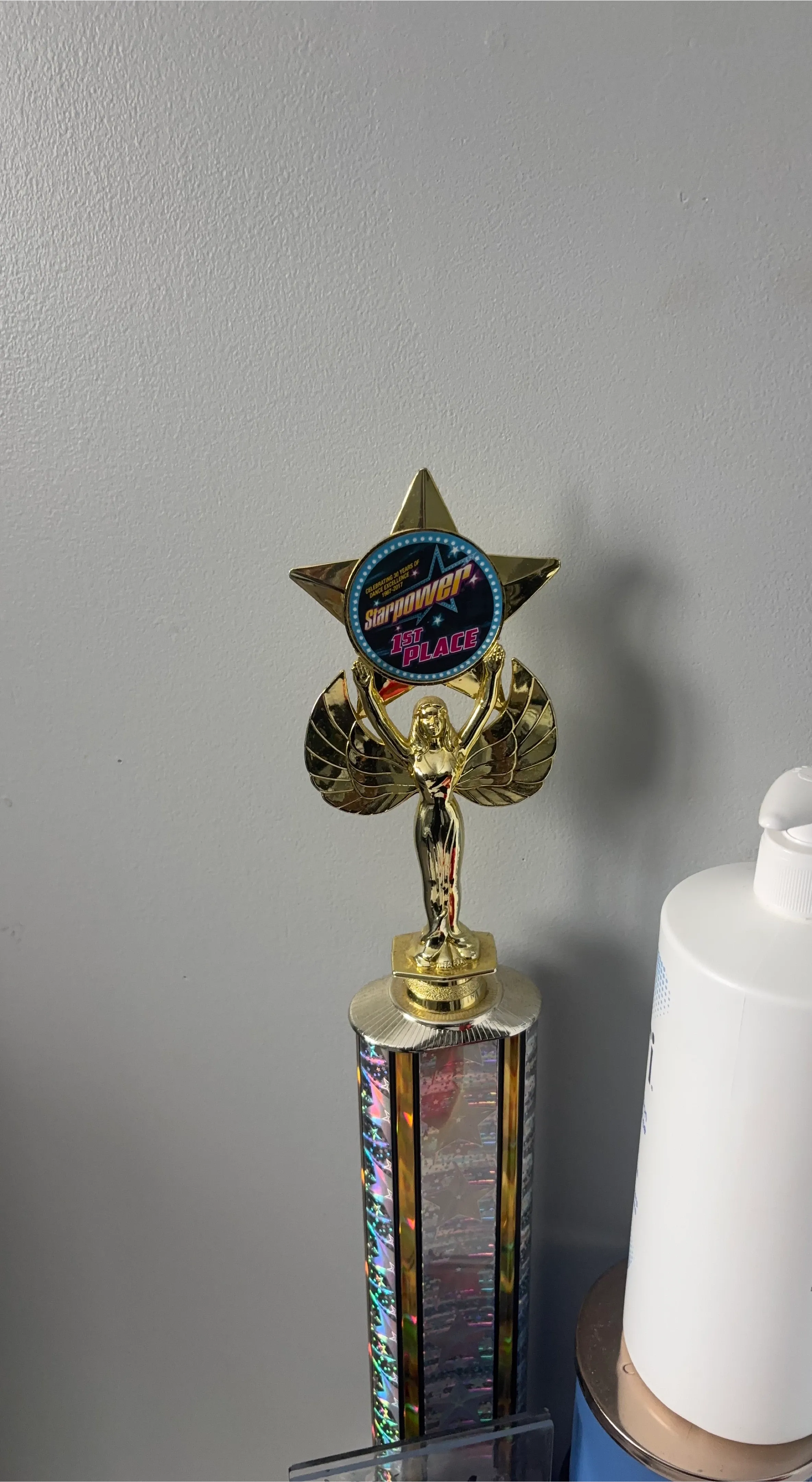 This is a Star Power 1st place trophy celebrating 30 years of dance excellence from 1987-2017. It's a gold-coloured trophy featuring a star emblem and an angel figure. Perfect for commemorating achievements in dance competitions!