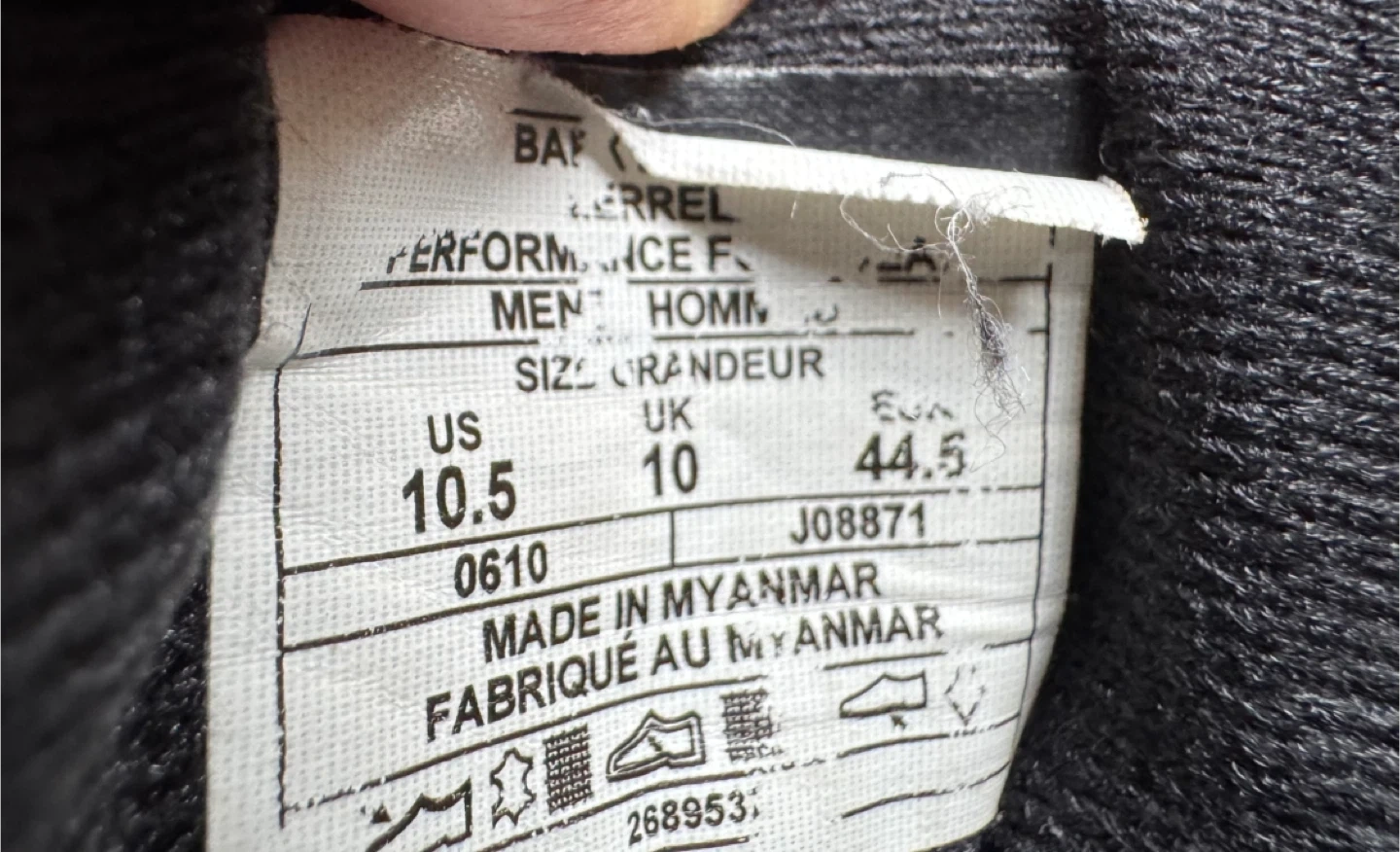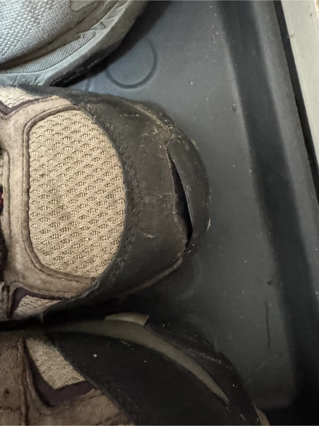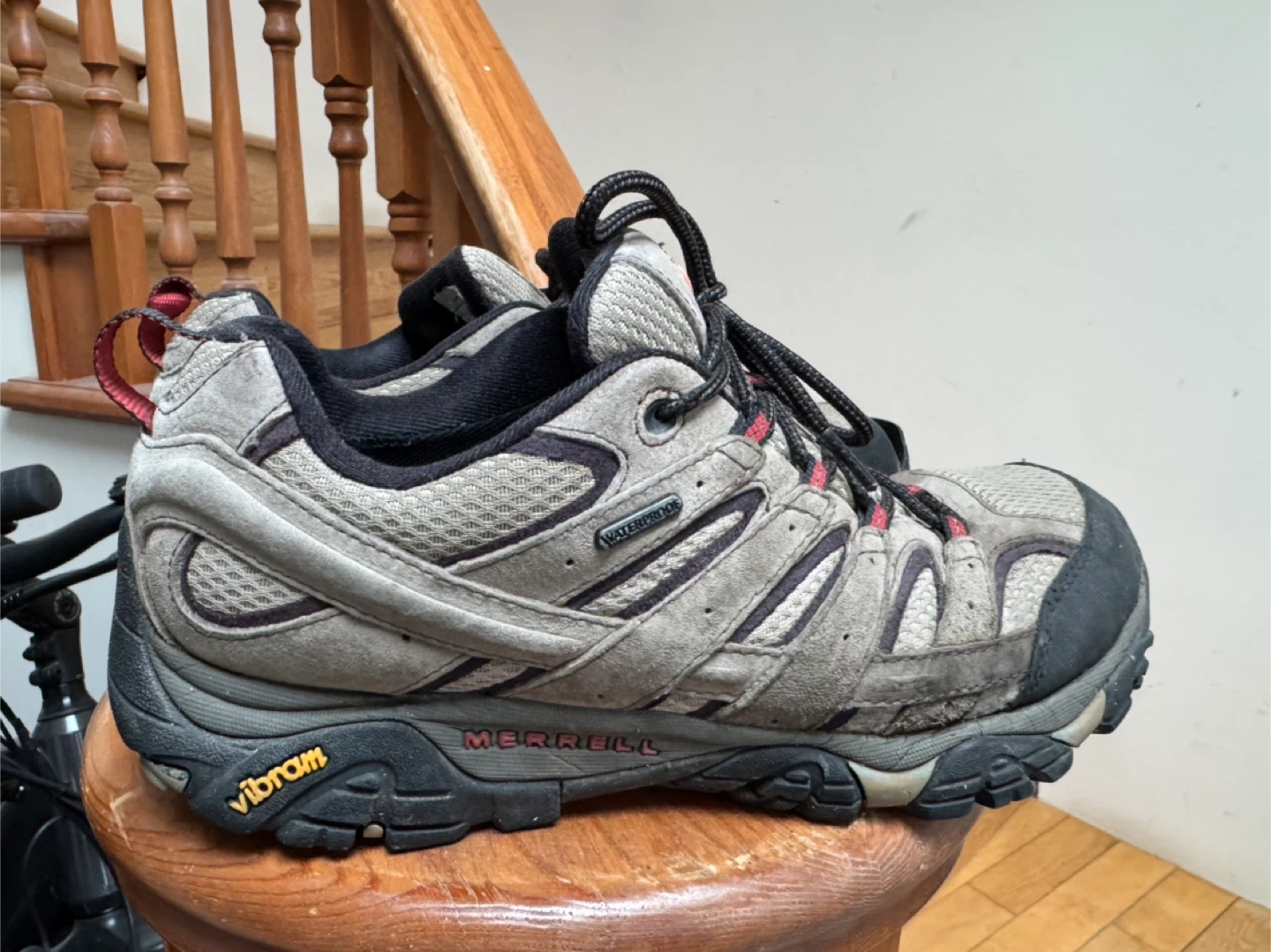Torn toe cap left side only (See picture). Used Merrell Moab hiking shoes in a men's US size 10.5. They're waterproof and feature Vibram soles for good grip.