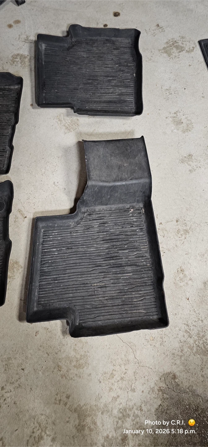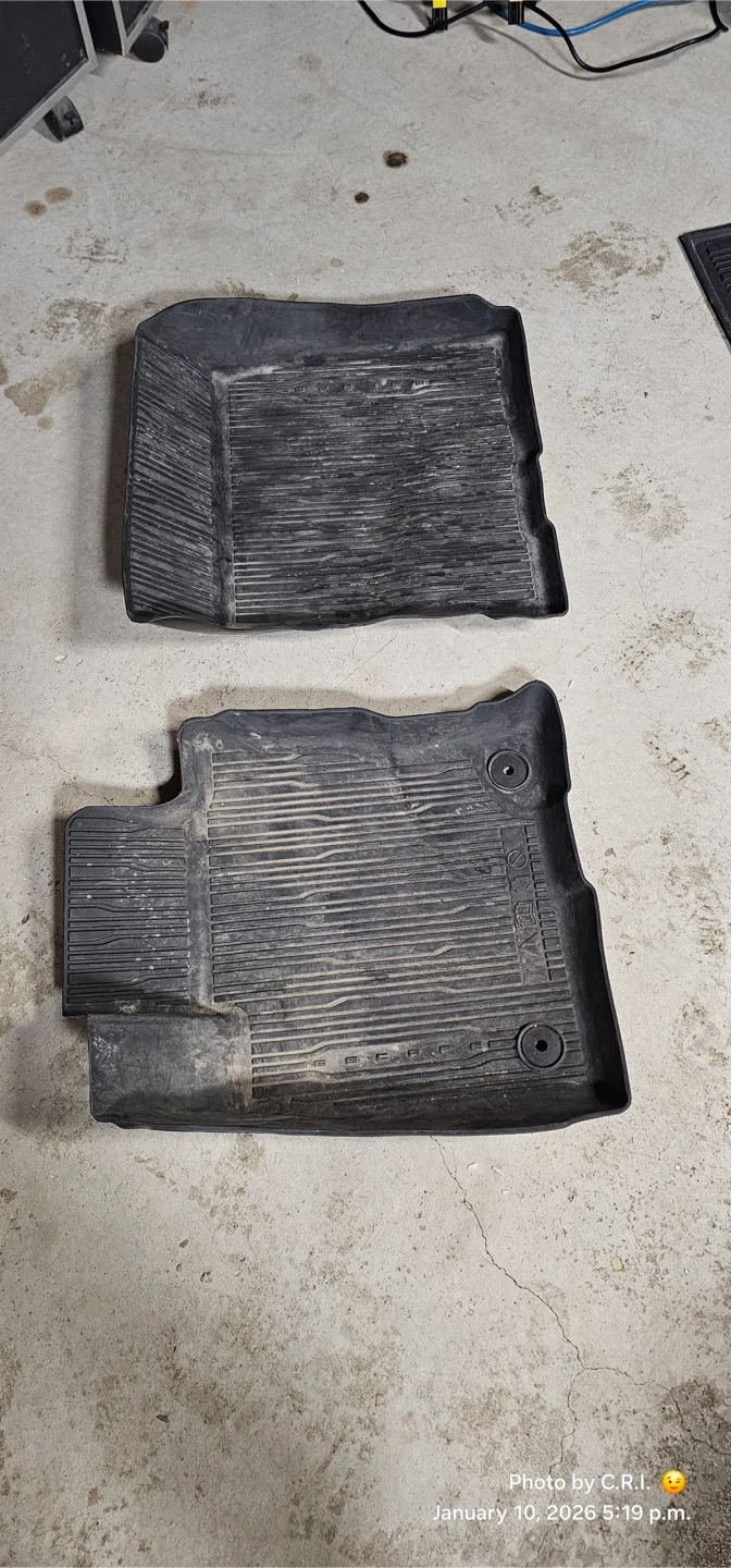 Set of all-weather rubber floor mats for a Ford Escape. Includes front and rear mats, plus a cargo liner. They're designed to protect your vehicle's interior from dirt and moisture.