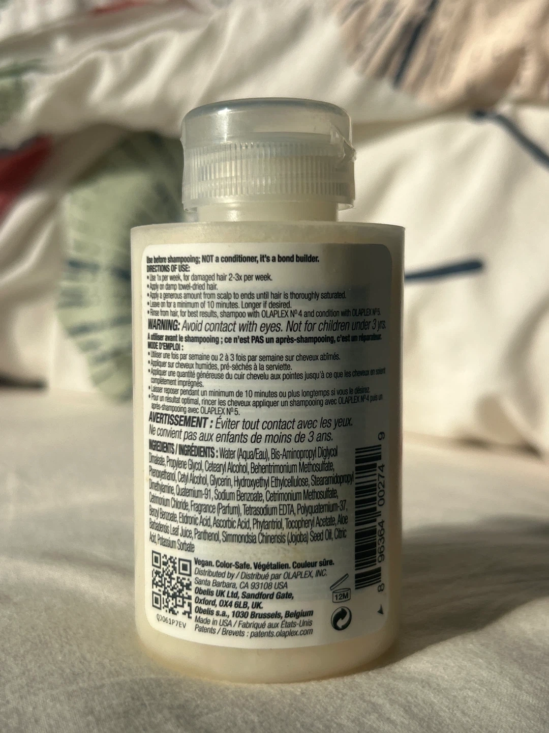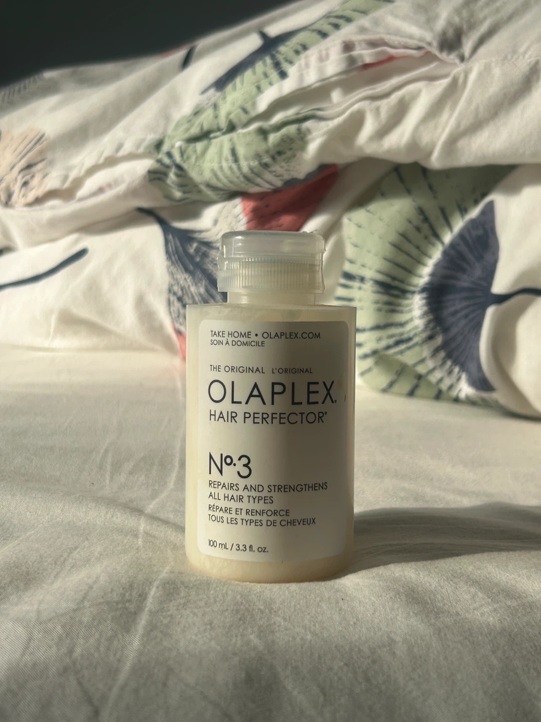 Olaplex No. 3 Hair Perfector is for all hair types. It repairs and strengthens hair. This bottle contains 100 ml, which is 3.3 fluid ounces.