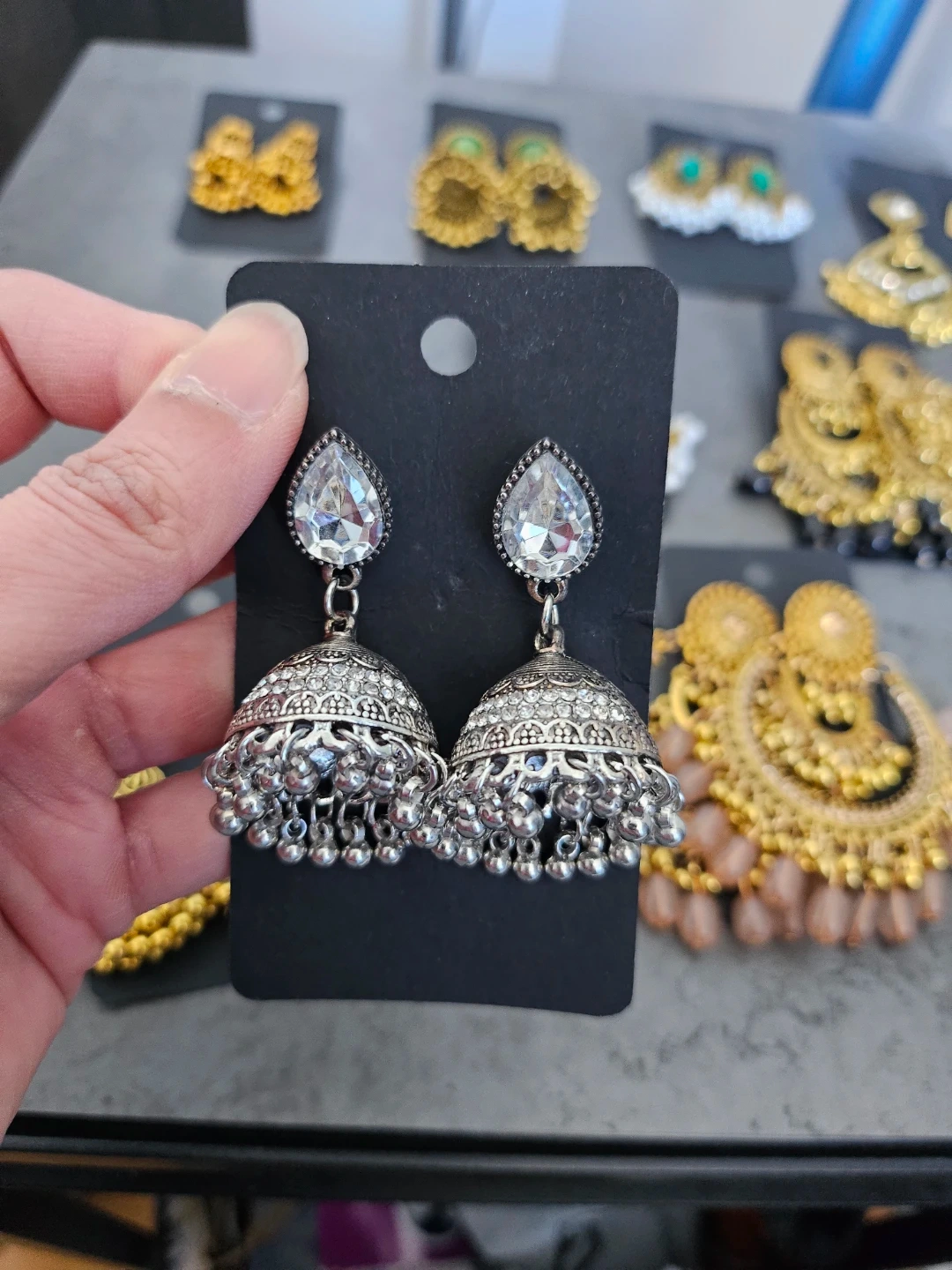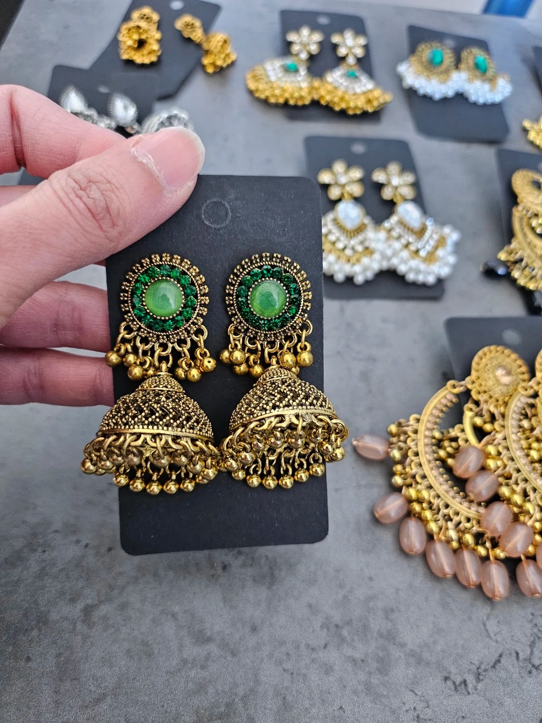 Beautiful collection of Eastern traditional style earrings. Has various designs like classic jhumkas, some with green stones, clear stones, and pearls. Also got some silver ones and big gold hoops with black beads. All new!