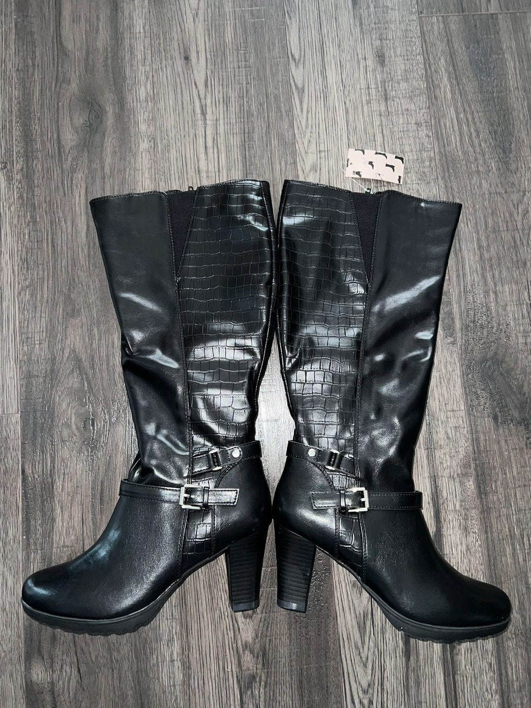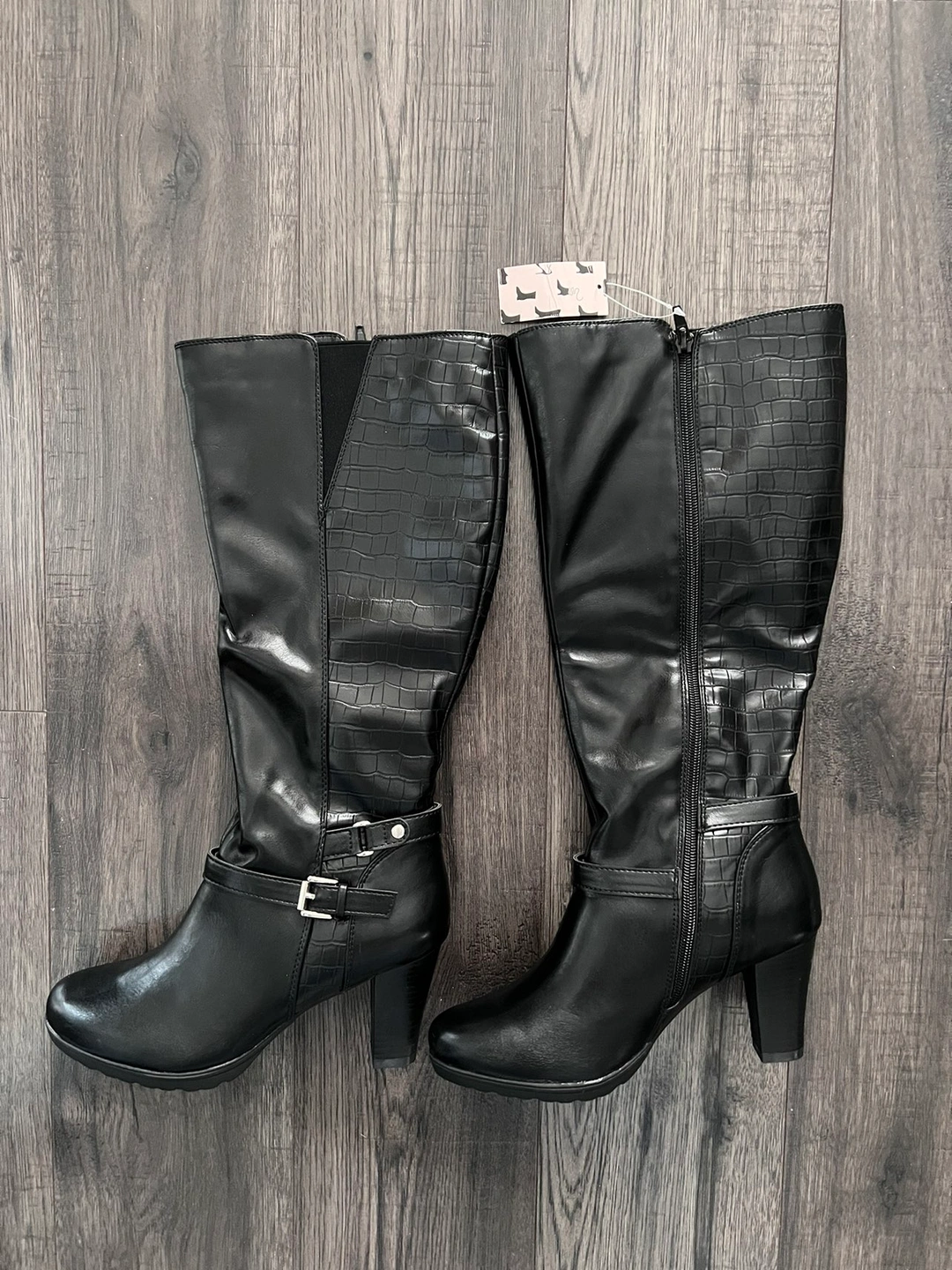 Beautiful knee high boots, size 7.5. Wide calf (but too wide for me). Material: vegan leather. Sole material: rubber.