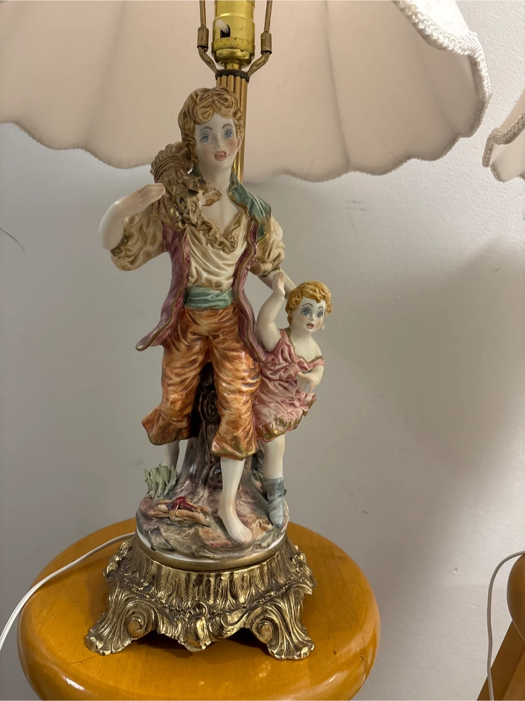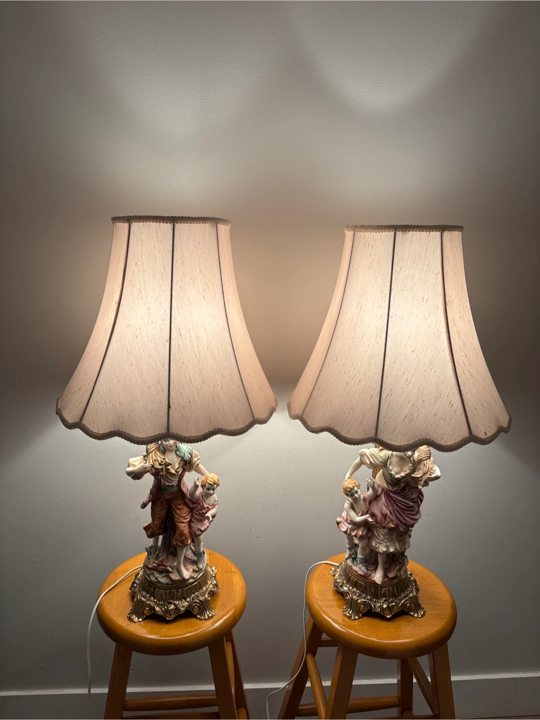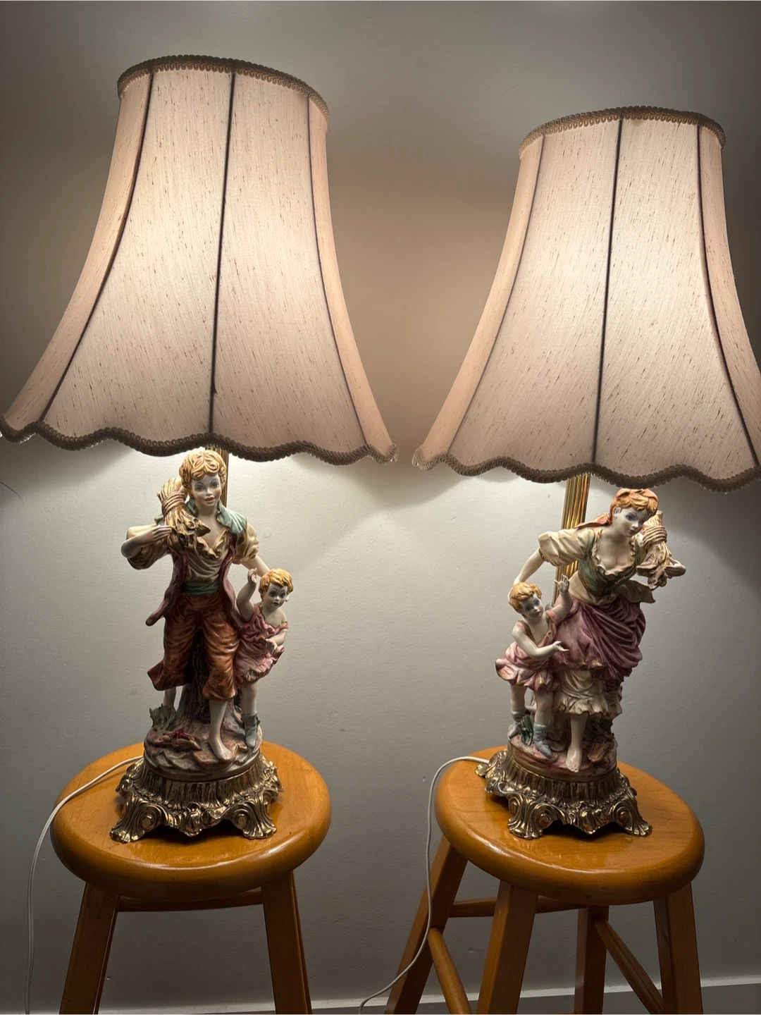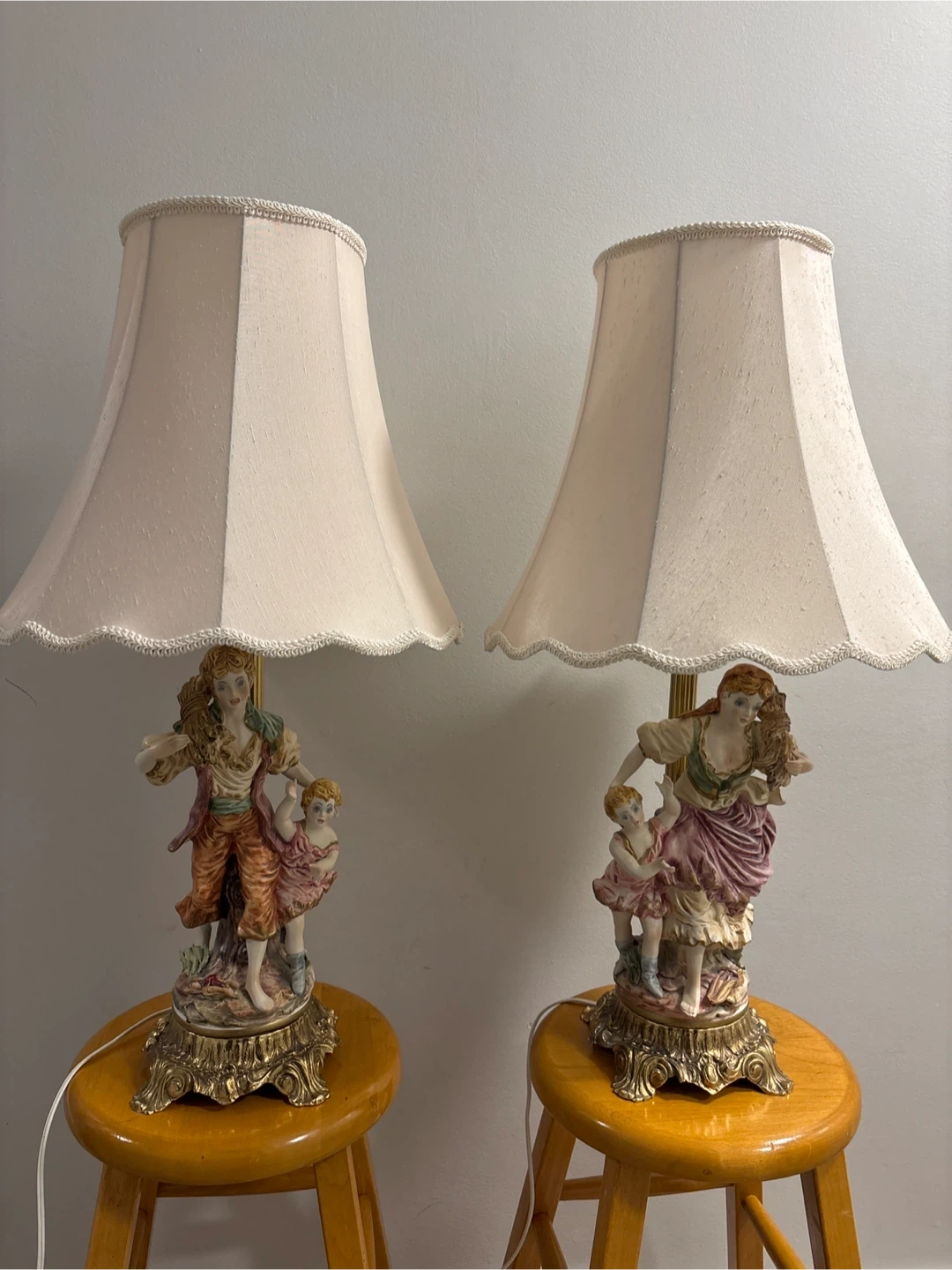 These vintage table lamps feature detailed porcelain figurines of a man a woman and two children, set on ornate brass bases. They come with cream-coloured lampshades that have a scalloped trim. Perfect for adding a classic touch to your living room or bedroom!
