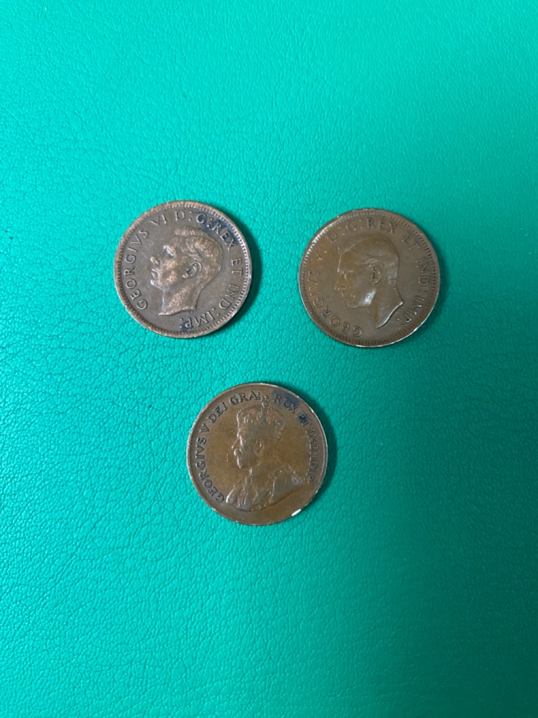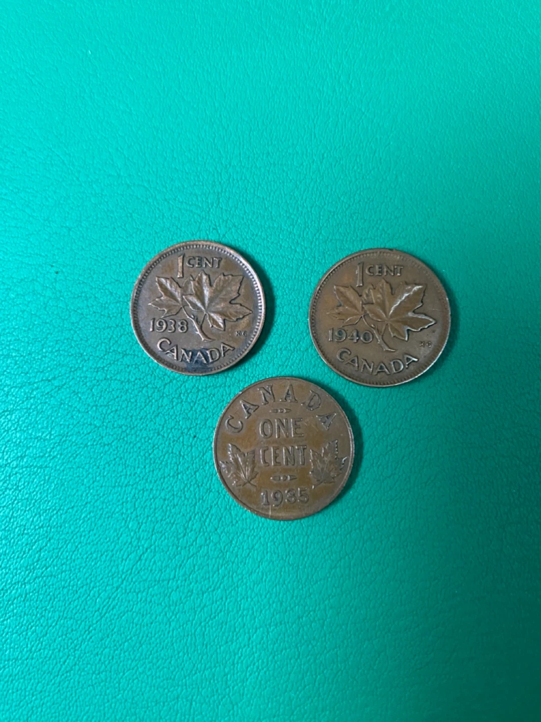 This is a collection of Canadian one-cent coins. The coins feature various Canadian monarchs and maple leaf designs. Years visible include 1935,1938, 1940, and others.