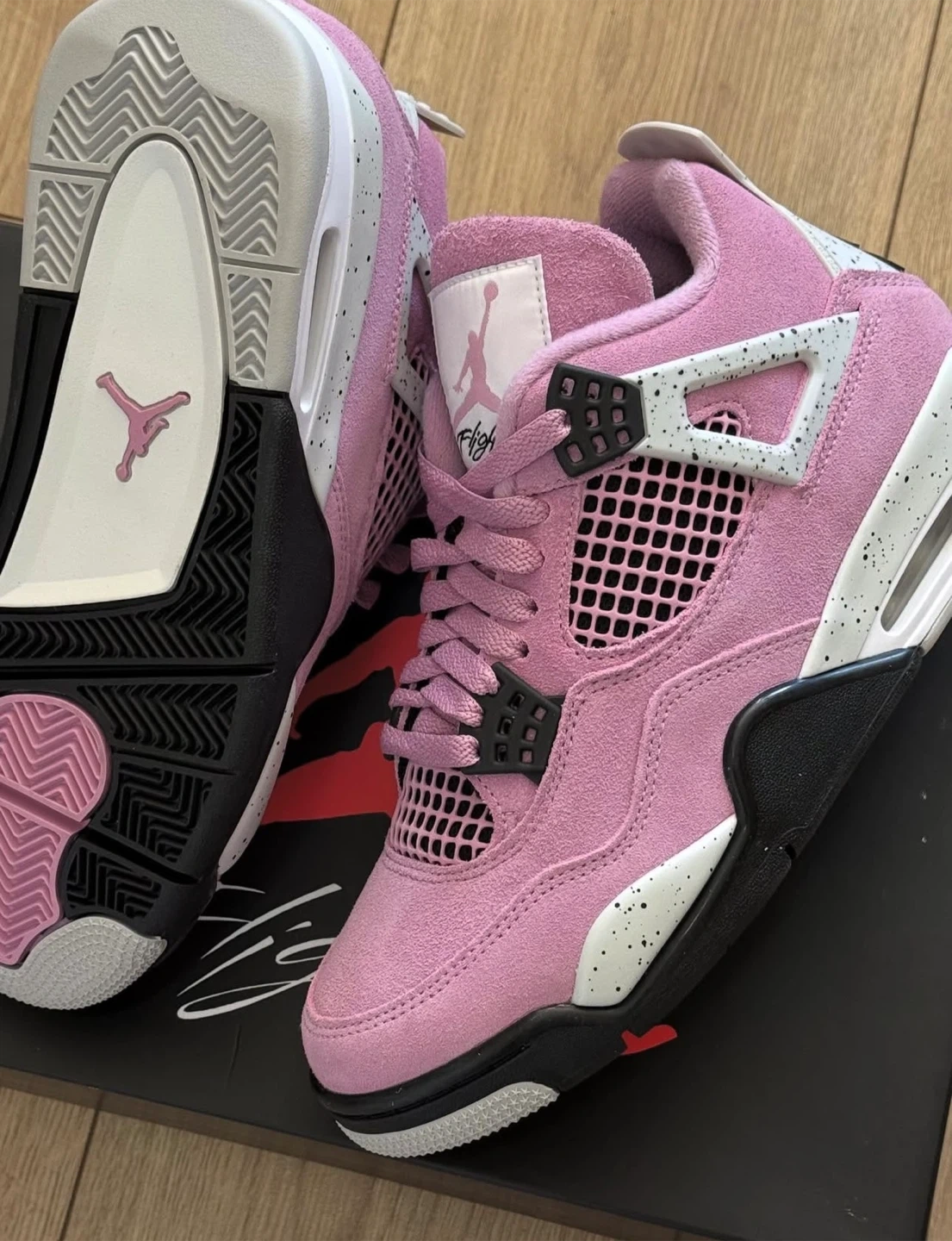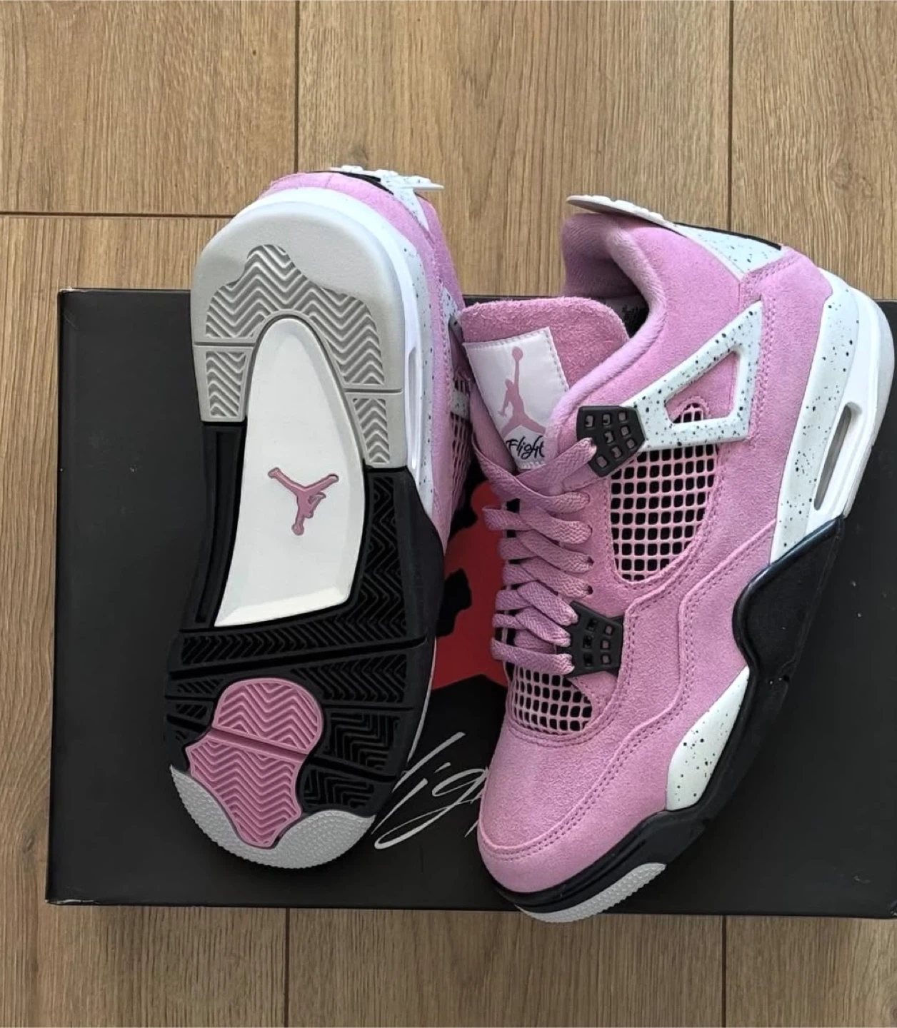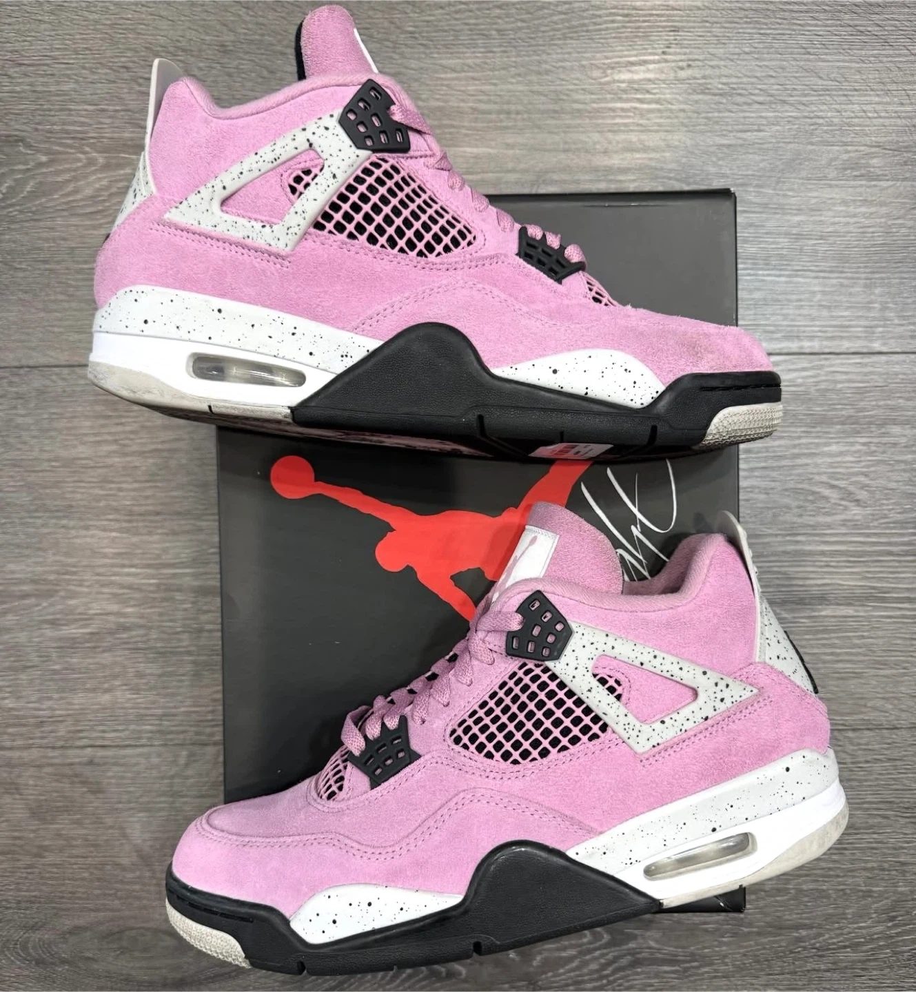 Selling a pair of Air Jordan 4 Retro in pink! These stylish sneakers are in great condition and come with the original box. Perfect for adding a pop of color to your wardrobe!