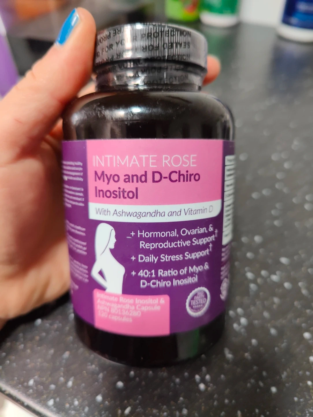 This supplement from Intimate Rose contains Myo and D-Chiro Inositol with Ashwagandha and Vitamin D. It's formulated for hormonal, ovarian, and reproductive support, plus daily stress support. The expiry date is February 2027. It's a 120 vegetarian capsule count.