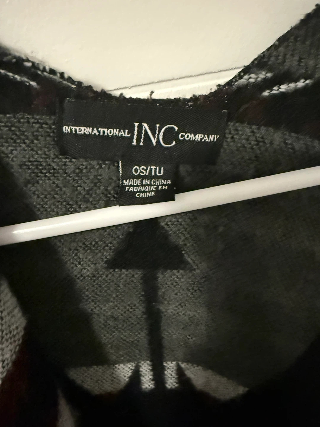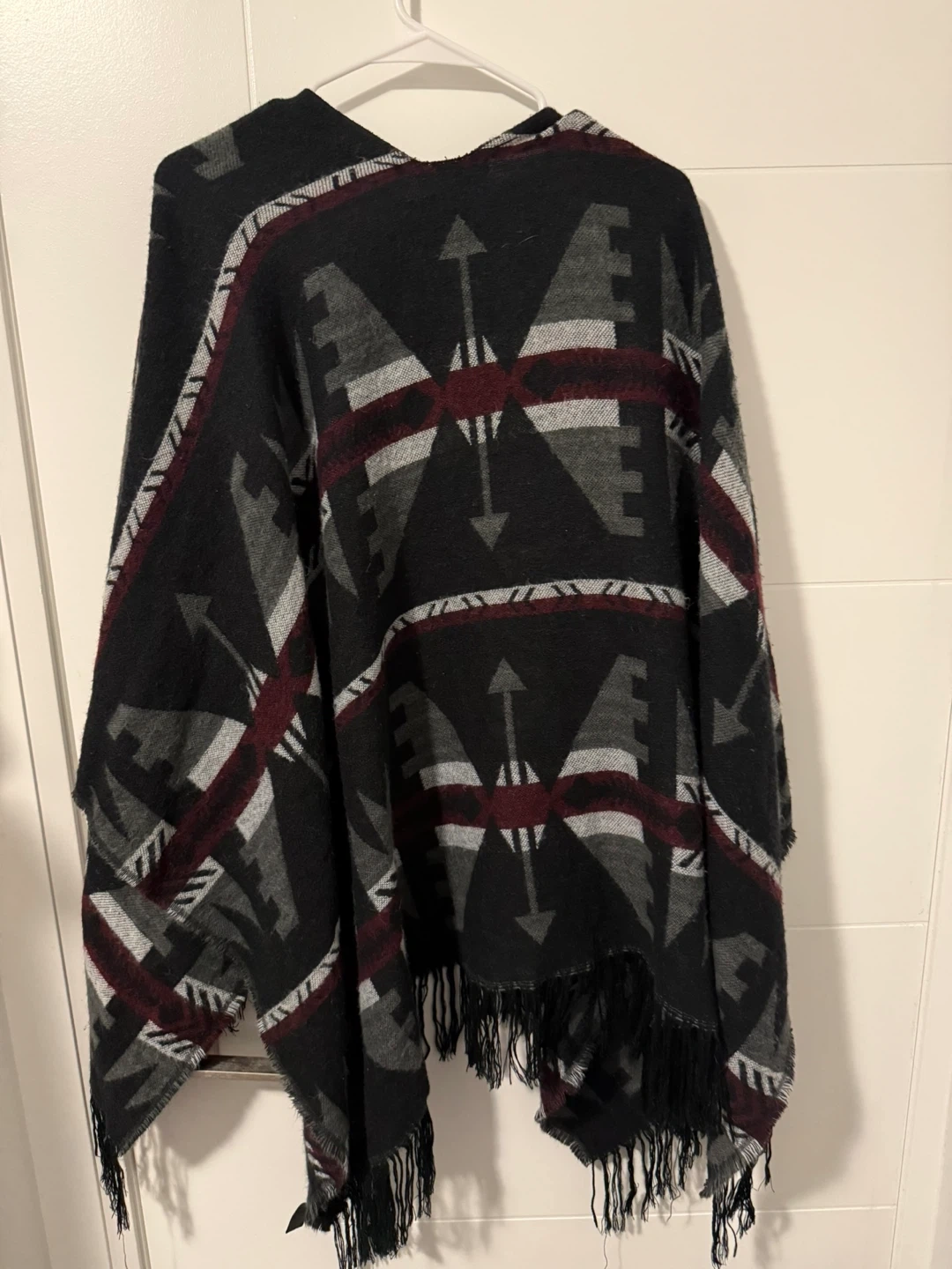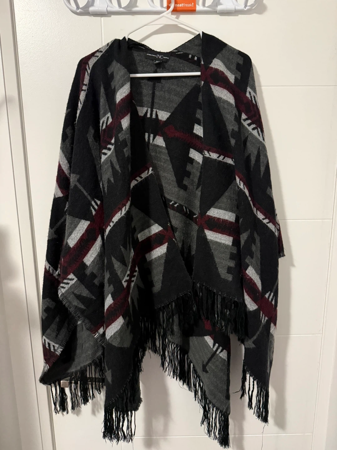 INC International Concepts poncho with a geometric pattern. OS/TU sizing. Black, grey, white, and burgundy colours. It's fringed along the bottom edges for added detail.
