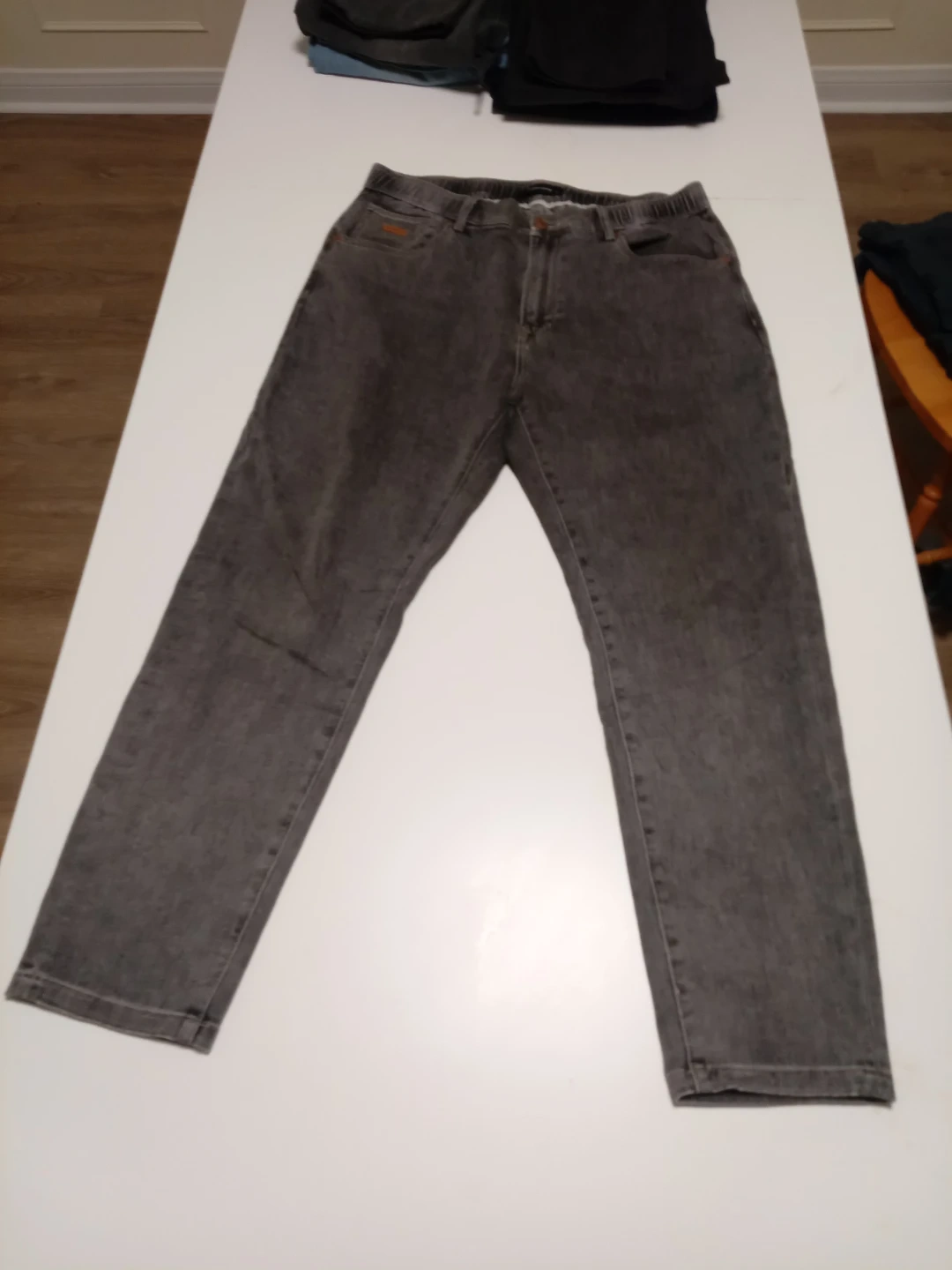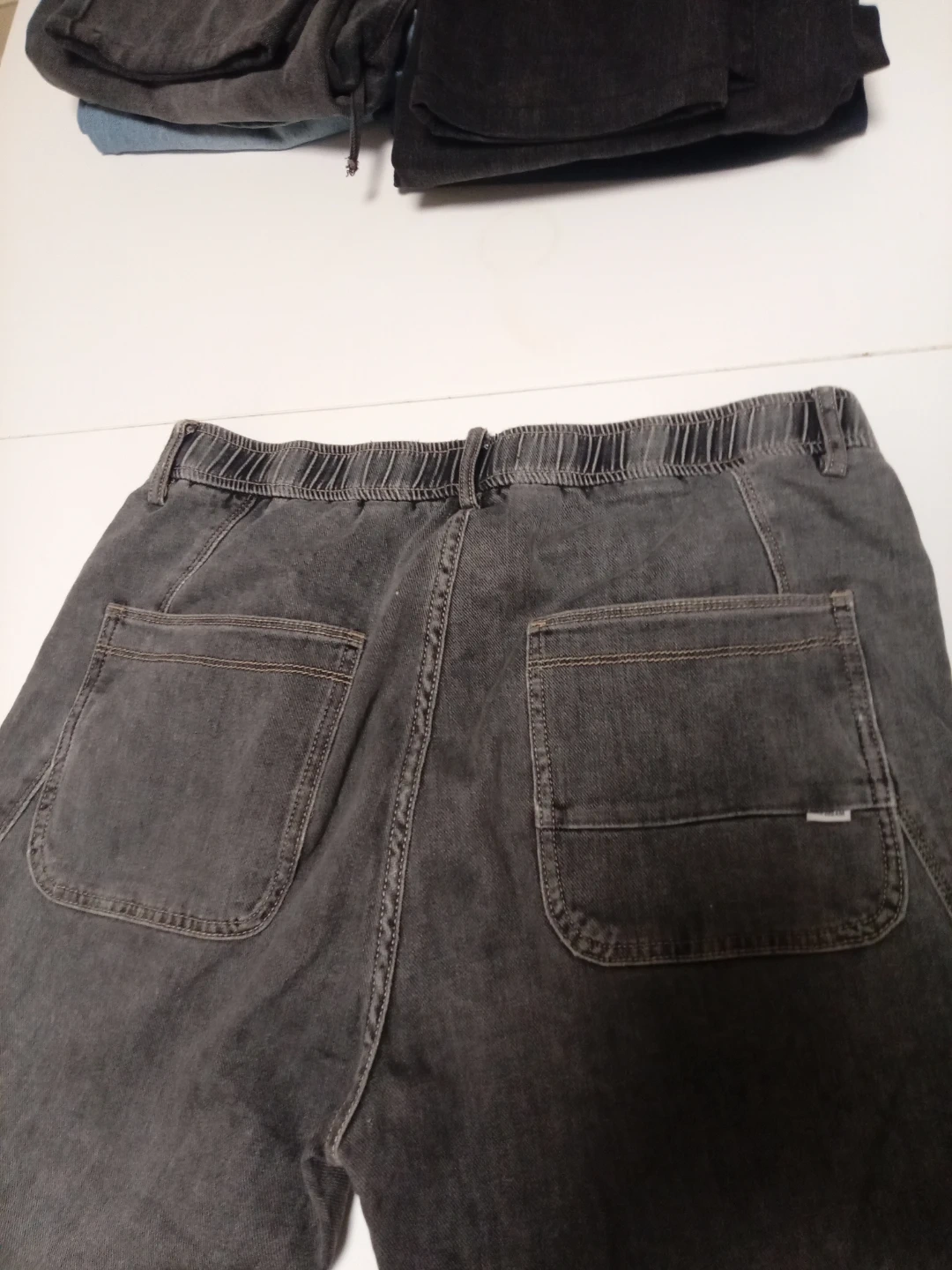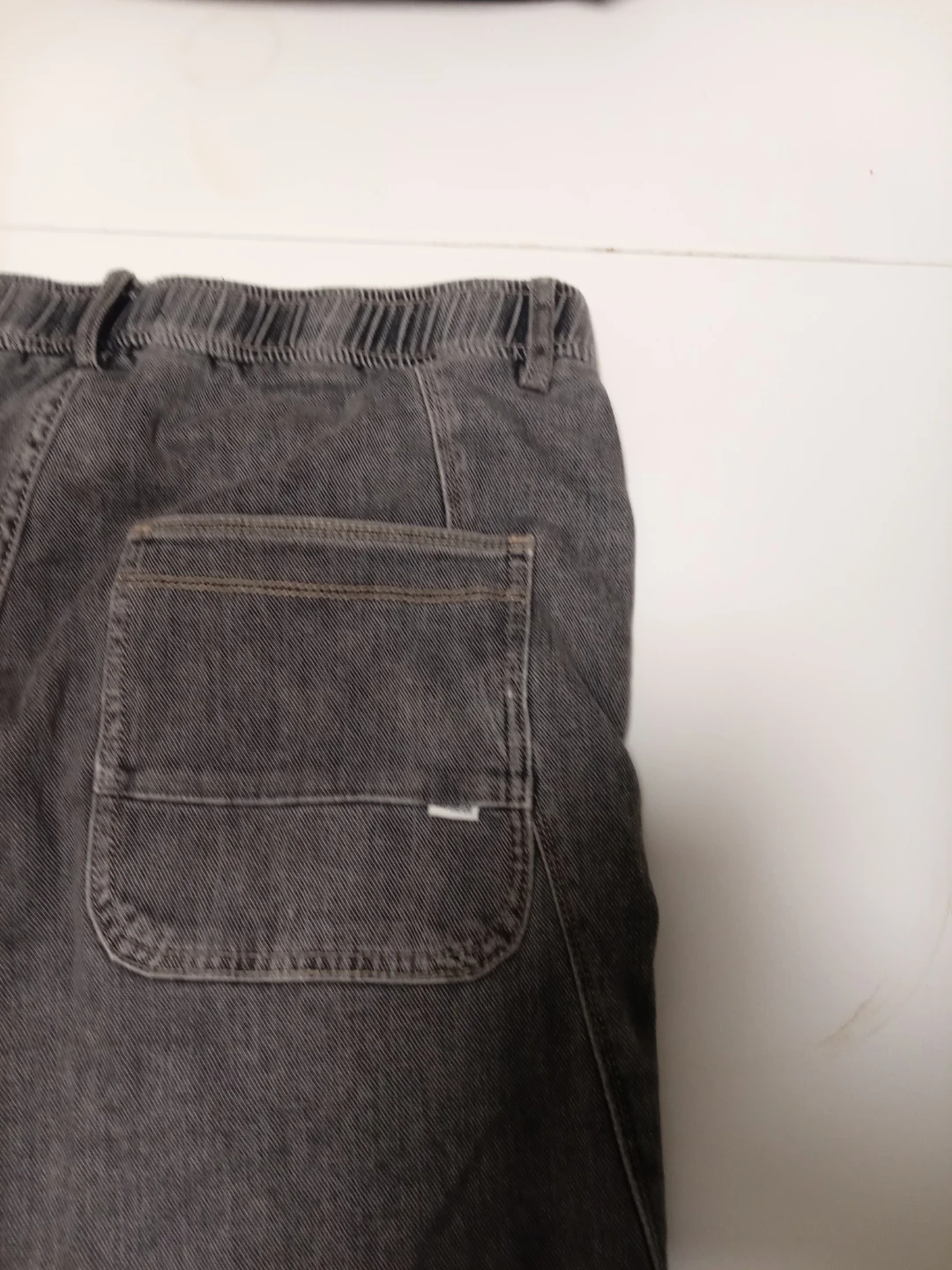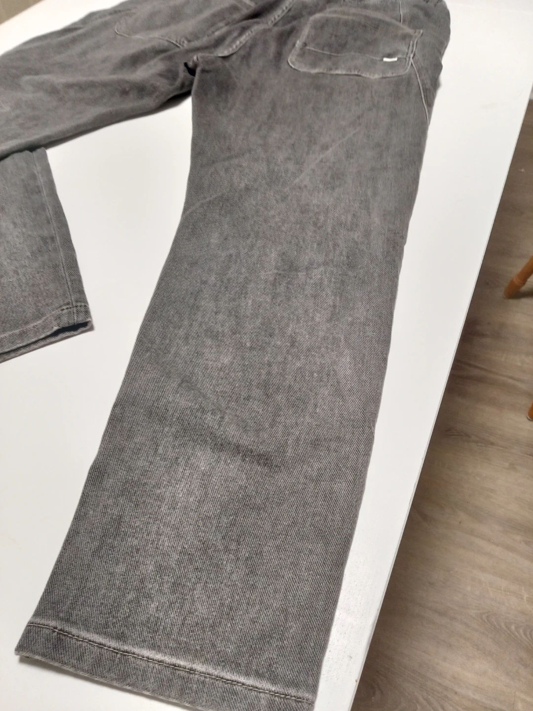 Classic grey wash denim jeans with an elastic waistband for comfort. These pants feature a traditional five-pocket design, including two back patch pockets. Made from durable denim material.