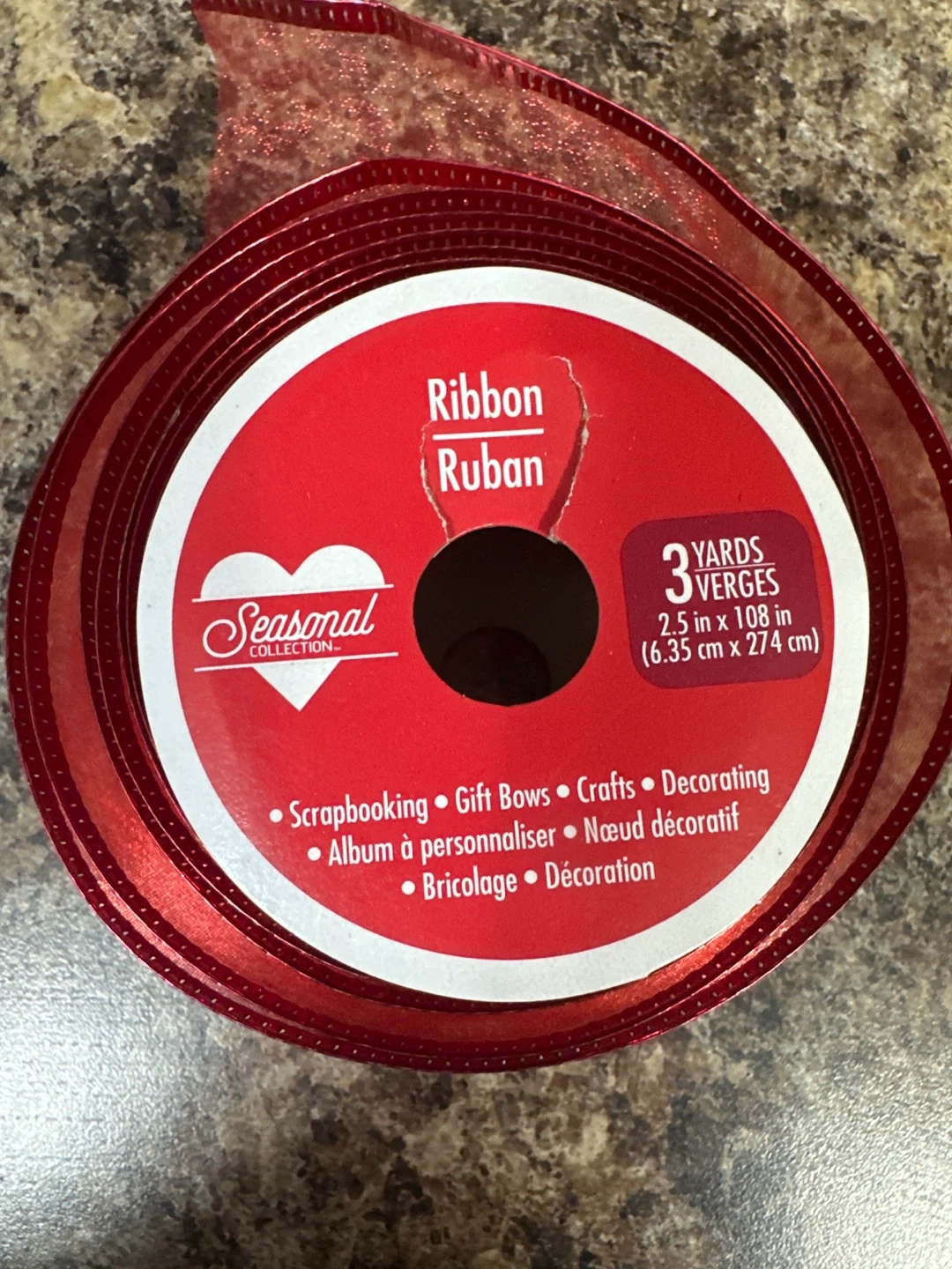 This is a roll of red ribbon from the Seasonal Collection. It's 2.5 inches wide and 108 inches (3 yards) long. Perfect for scrapbooking, gift bows, crafts, and decorating!
