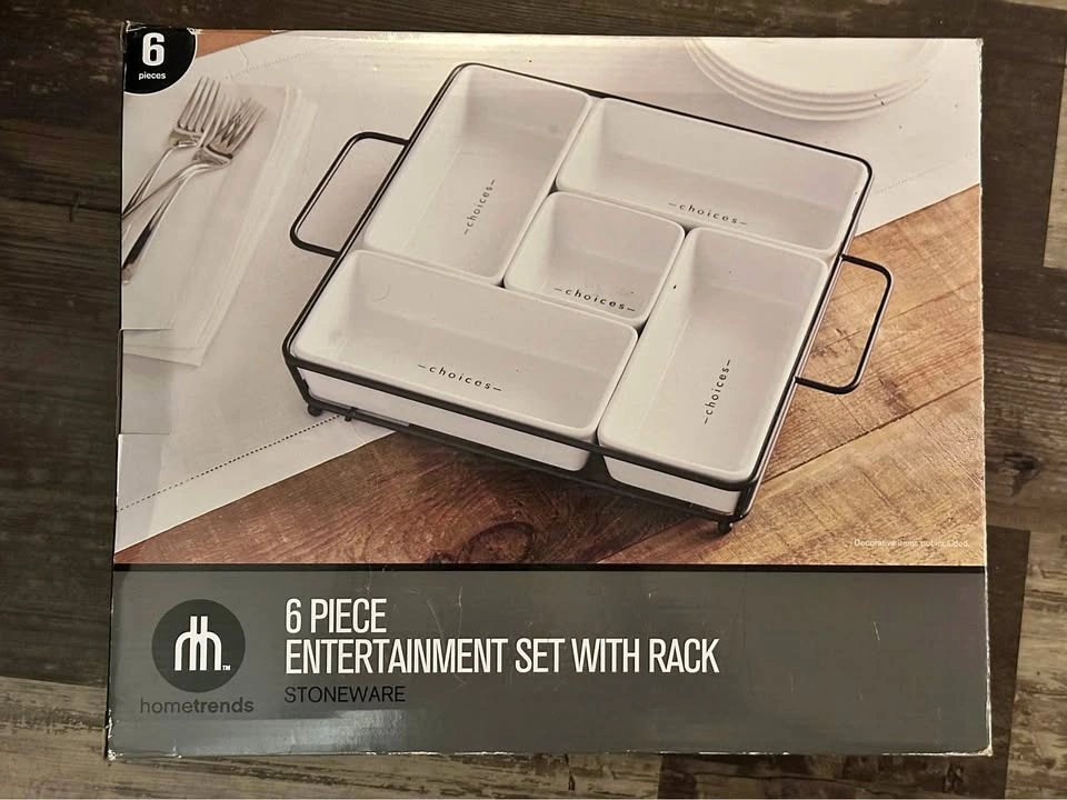Brand new HomeTrends 5-piece stoneware entertainment/serving set with metal rack. Ideal for snacks, appetizers, or entertaining guests. Clean, modern design. Set includes: 5 white stoneware serving dishes, Black metal carrying/display rack. New in box, never used. Local pickup only.