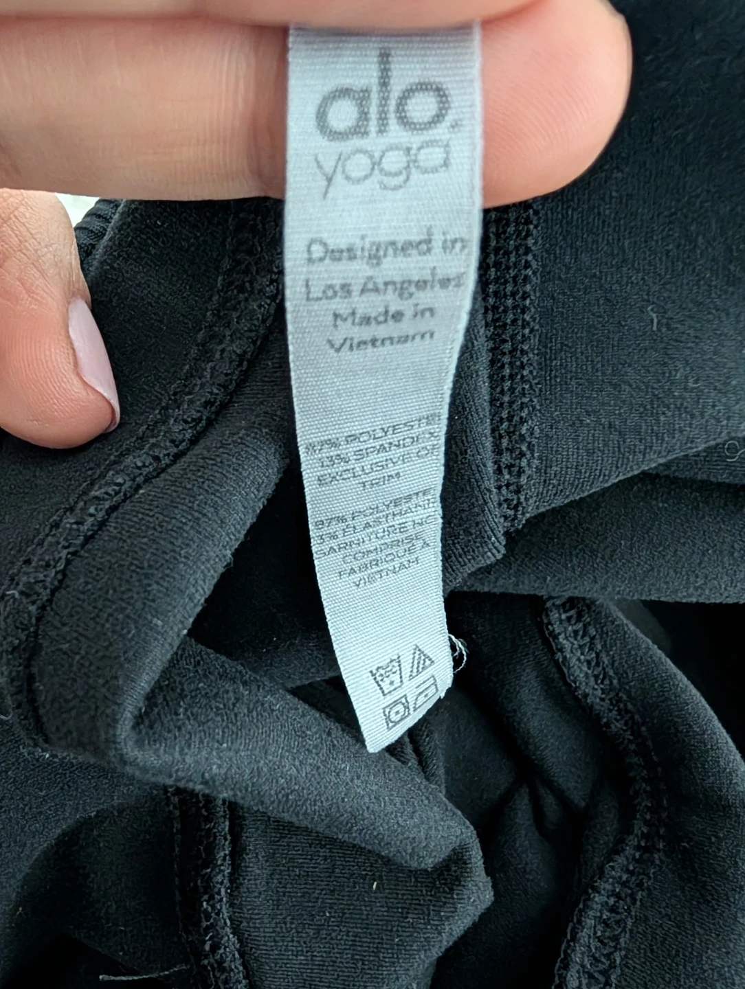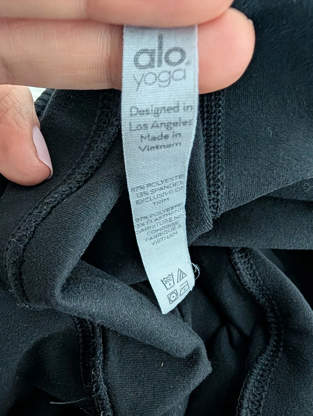 Alo Yoga black leggings, perfect for your yoga practice or everyday wear. Made with a blend of polyester and spandex for a comfortable fit. Designed in Los Angeles and made in Vietnam.