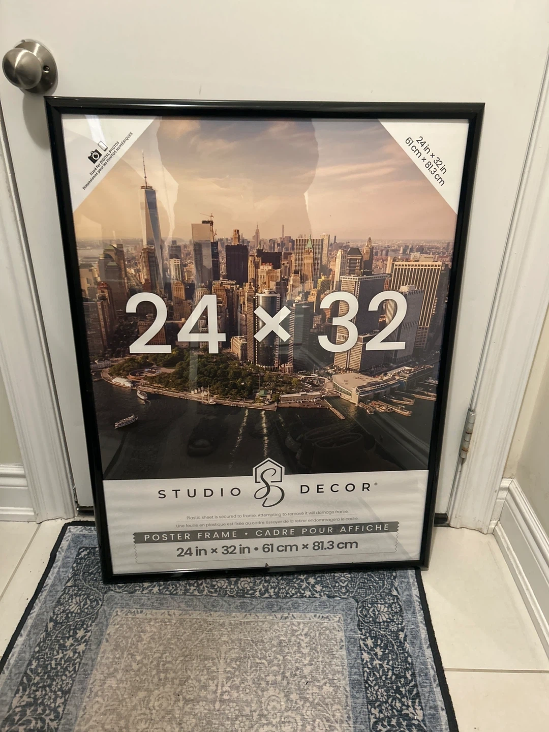 This is a Studio Decor poster frame. It fits a 24x32 inch (61cm x 81.3cm) picture. The plastic sheet is secured and should not be removed.