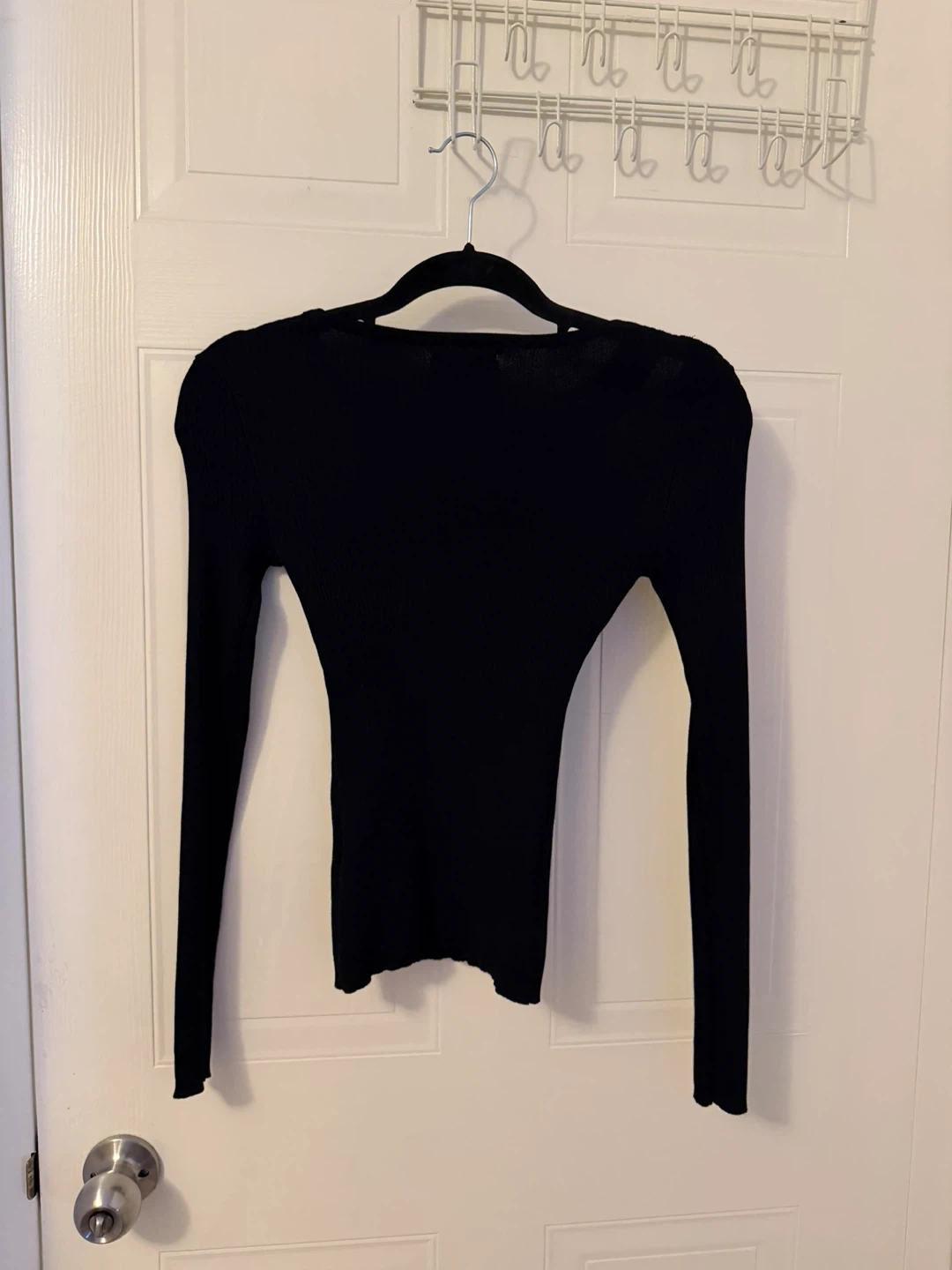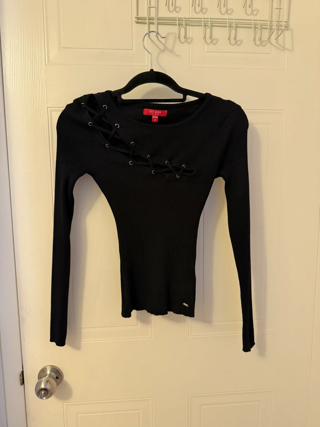 This Guess sweater is black with a ribbed texture. It features a unique lace-up detail on the front neckline.