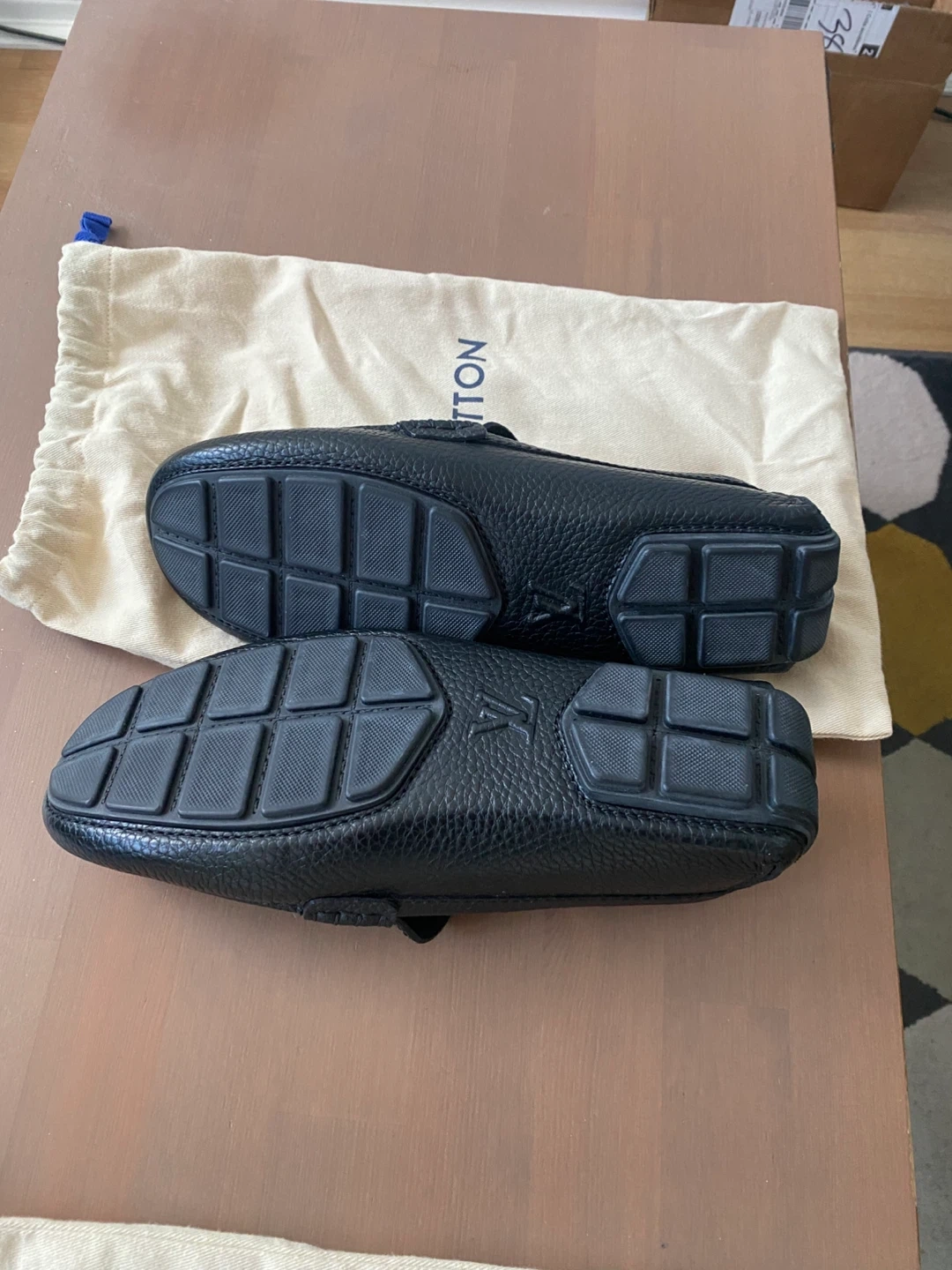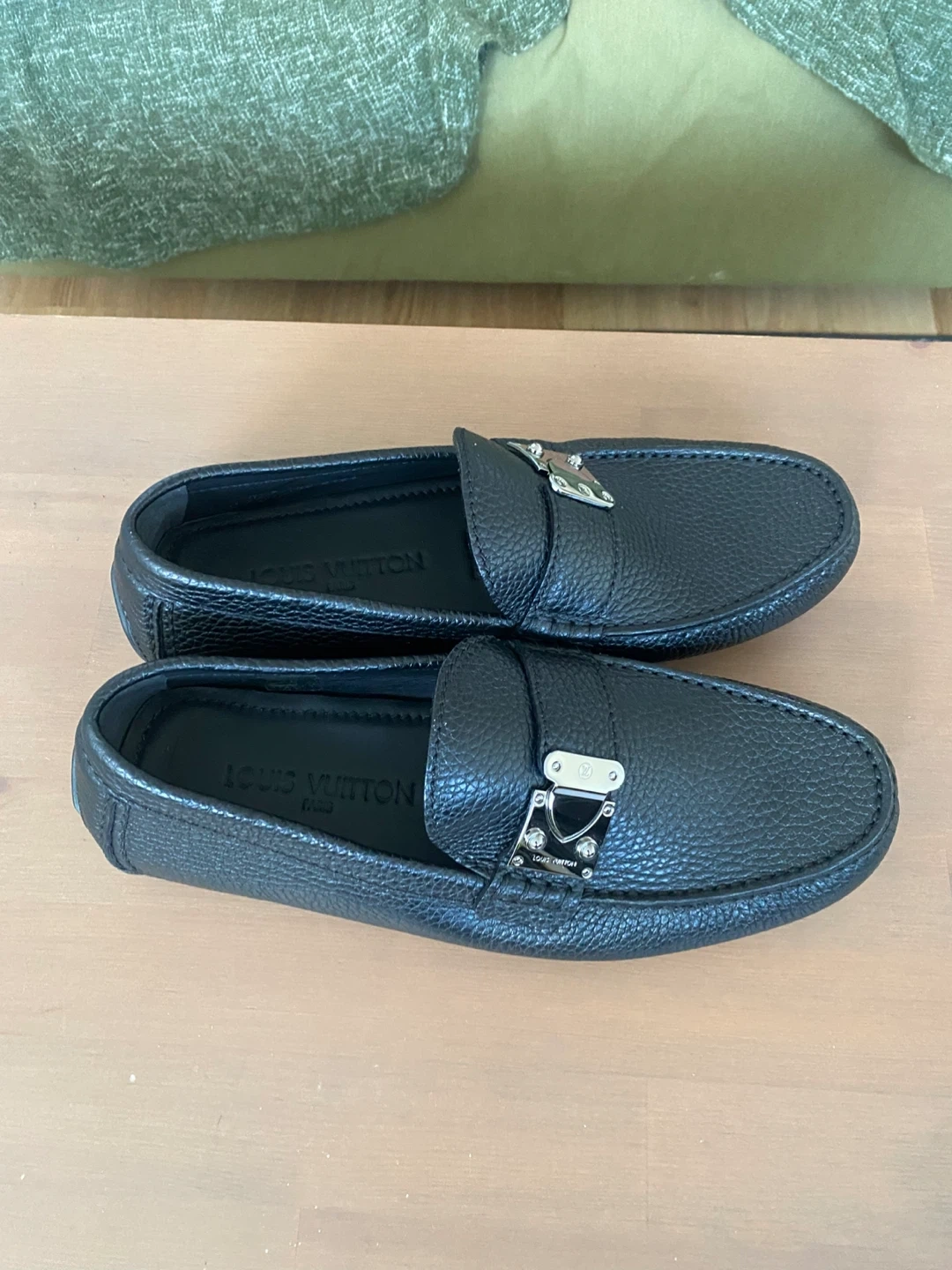 Classic Louis Vuitton loafers in black pebbled leather. Comes with dust bags and original booklet. Comfortable and stylish for any occasion!