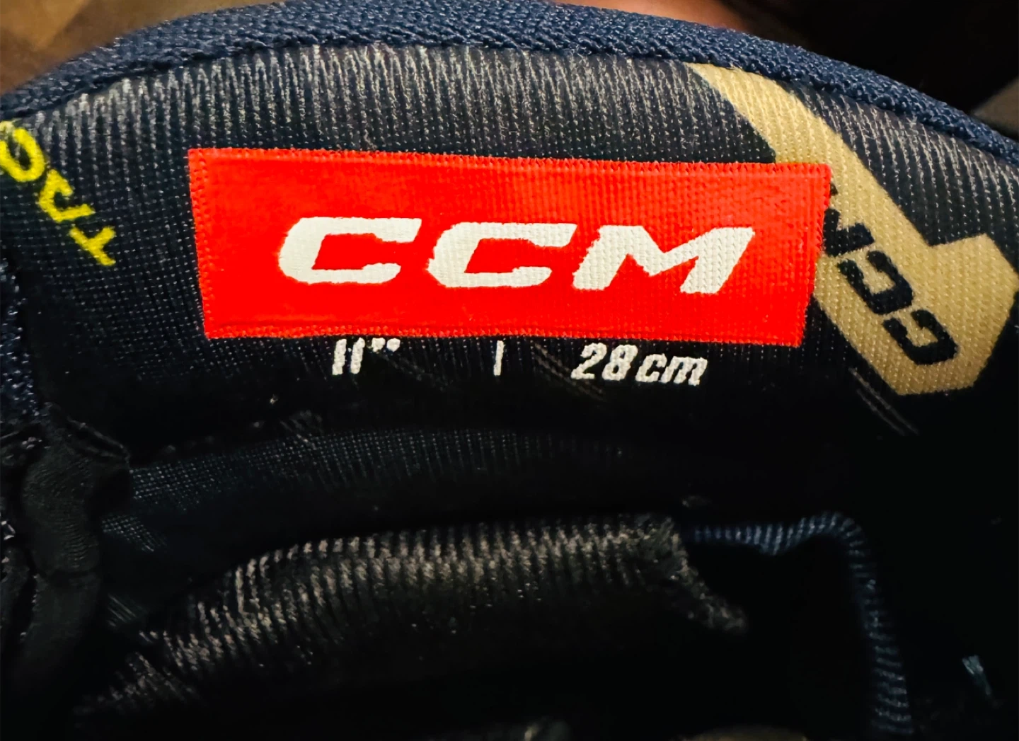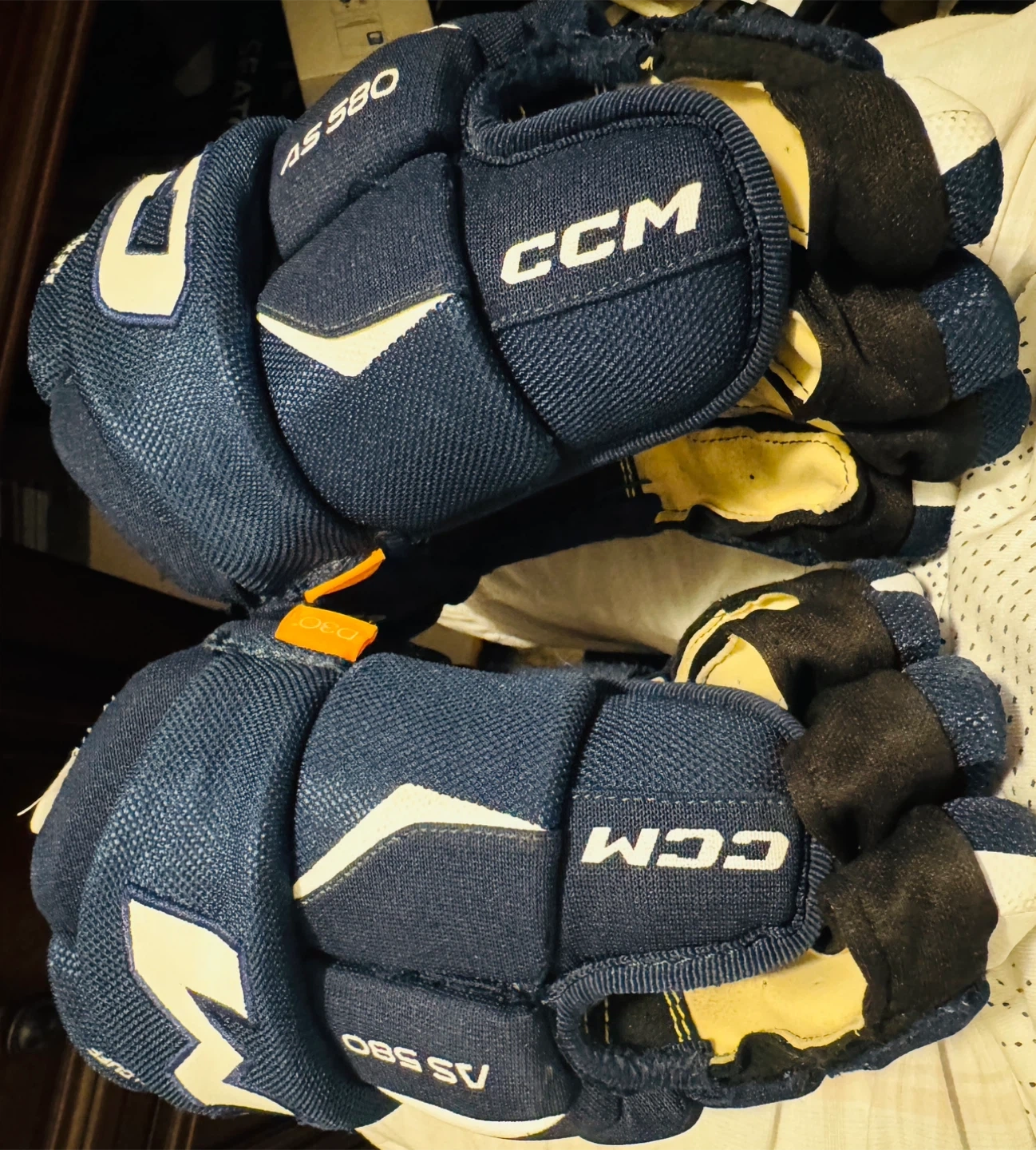 These CCM AS 580 hockey gloves are navy blue and white. They are size 11 inches or 28 cm. These gloves are great for hockey players looking for solid protection and mobility on the ice!