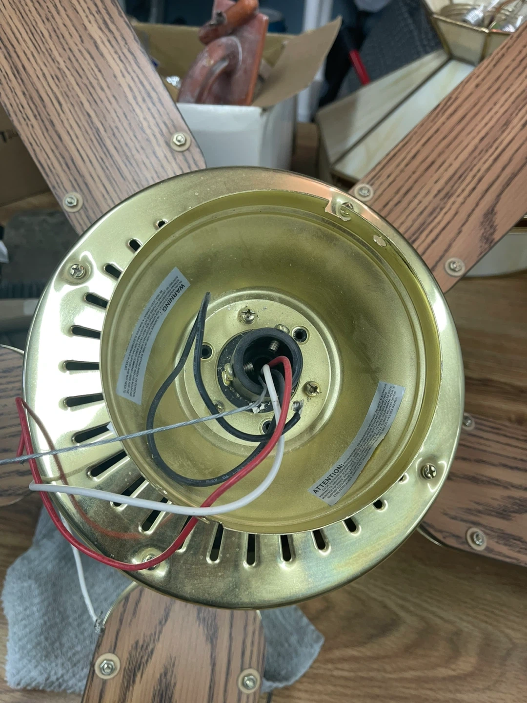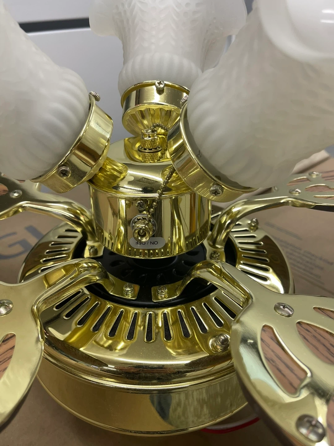 This Glacier Bay ceiling fan features four reversible wood-grain blades and three lights with frosted glass shades. It comes with two light bulbs. 41”Width x 14” Hight. 17” Blades. Cash only