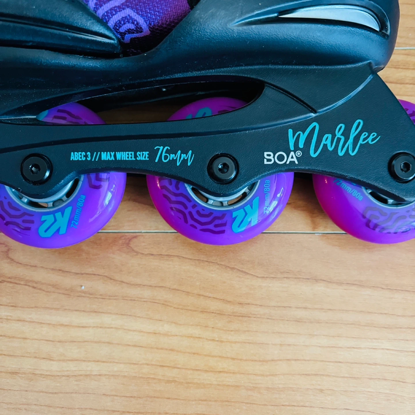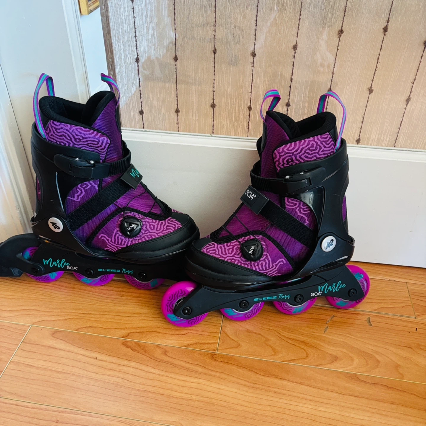 K2 Marlee adjustable inline skates designed for young skaters. They feature a BOA Fit System for easy adjustments and K2's Original Softboot for comfort. Barely used.