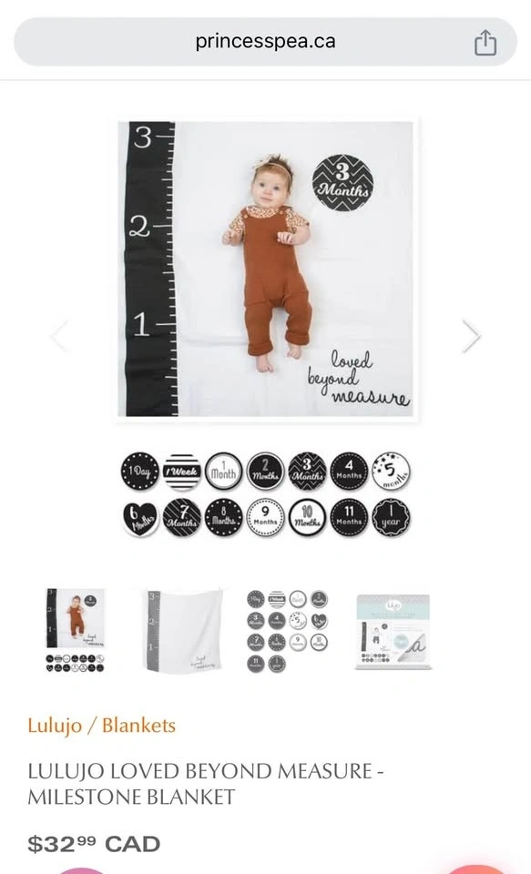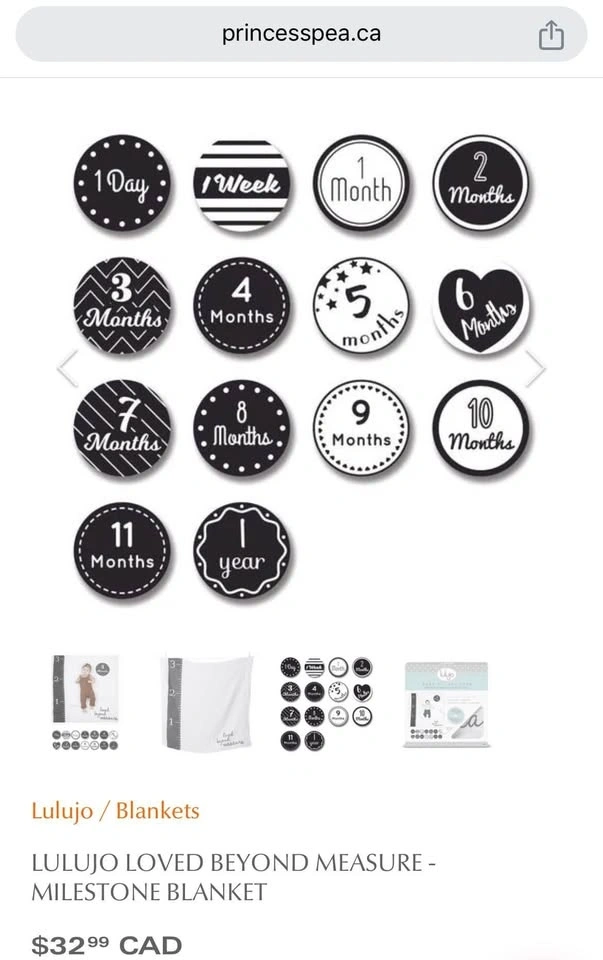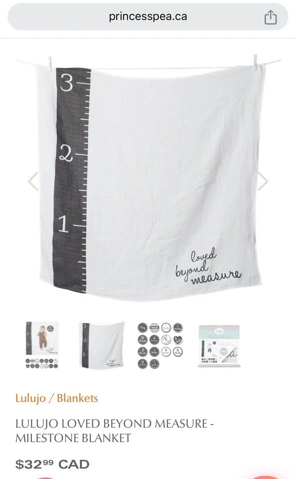 Turn milestones into memories with this large, super soft, premium quality milestone blanket and milestone cards set. Perfect for capturing baby's first months. Includes 1 large muslin blanket and 7 double-sided cards with 14 milestones. Located in Don Mills-Eglinton.