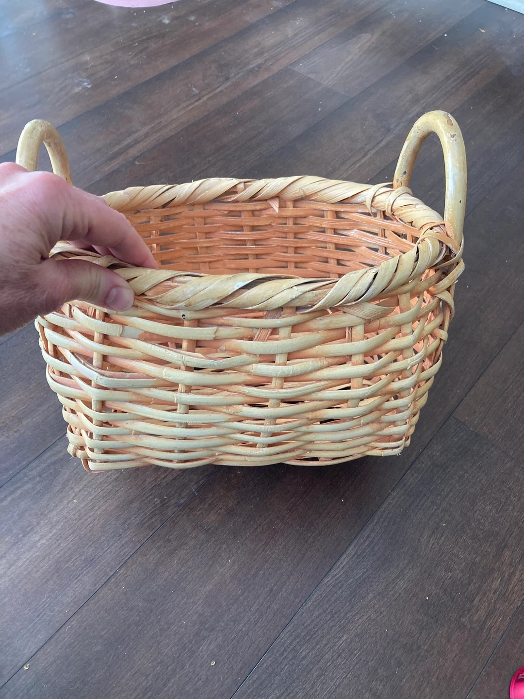 A charming wicker basket, perfect for storage or display. It's made from natural woven material and features two sturdy handles for easy carrying. This basket's rustic design adds a cozy touch to any my hand for scale in second photo.