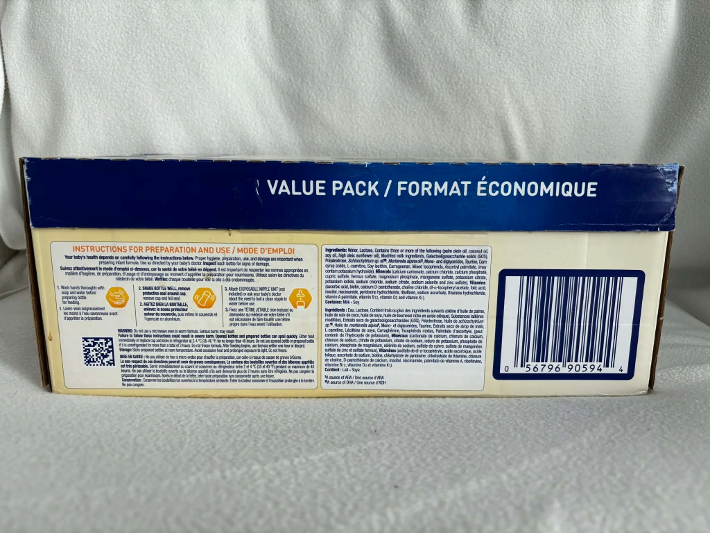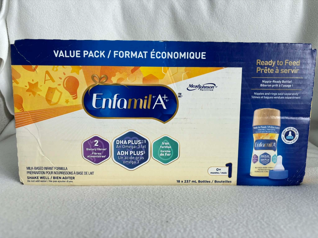 Ready to Feed Enfamil A+ milk-based infant formula in 18 bottles, each 237 mL. Enriched with iron and DHA plus for brain and eye development. Nipple and rings sold separately.