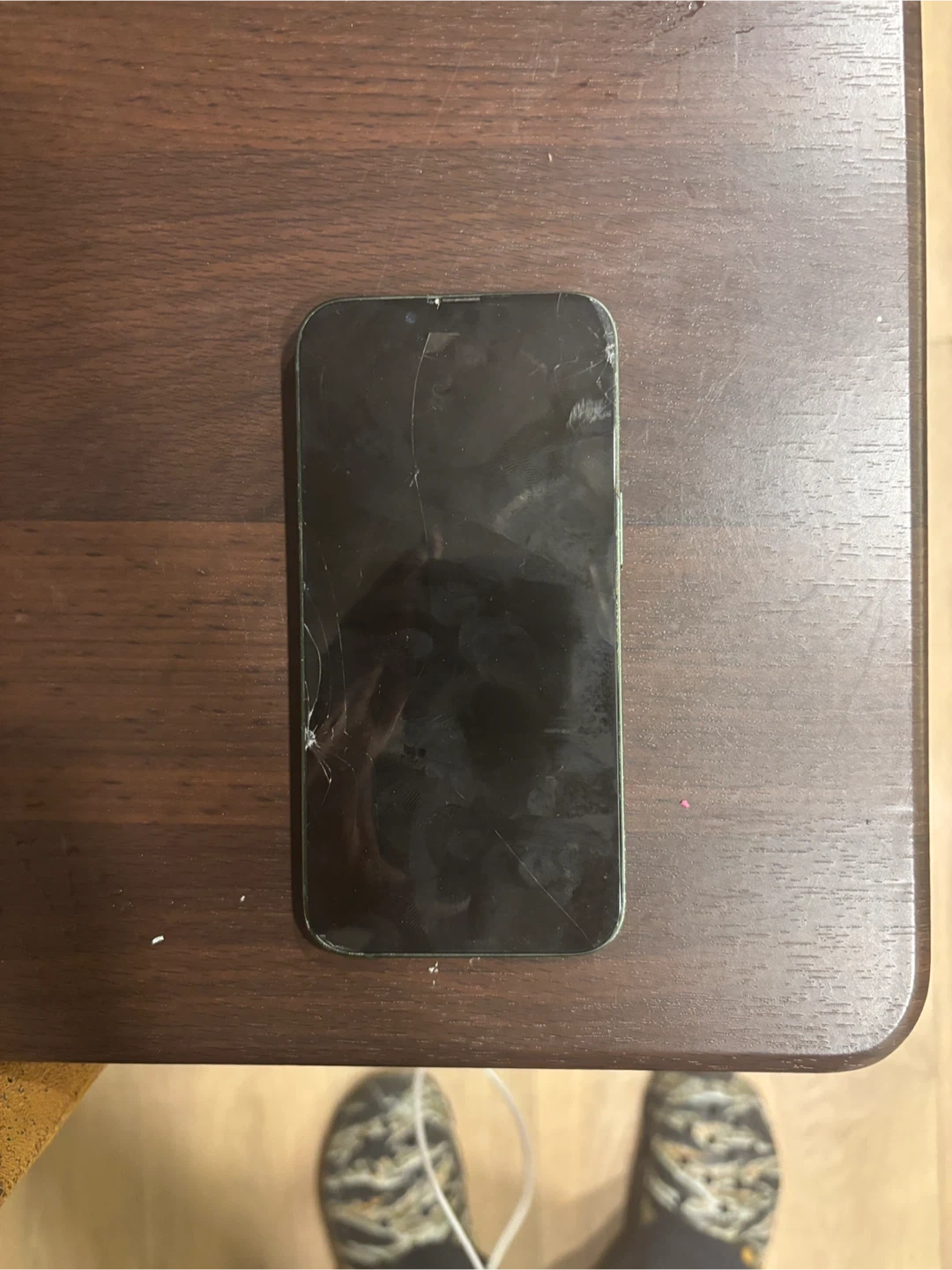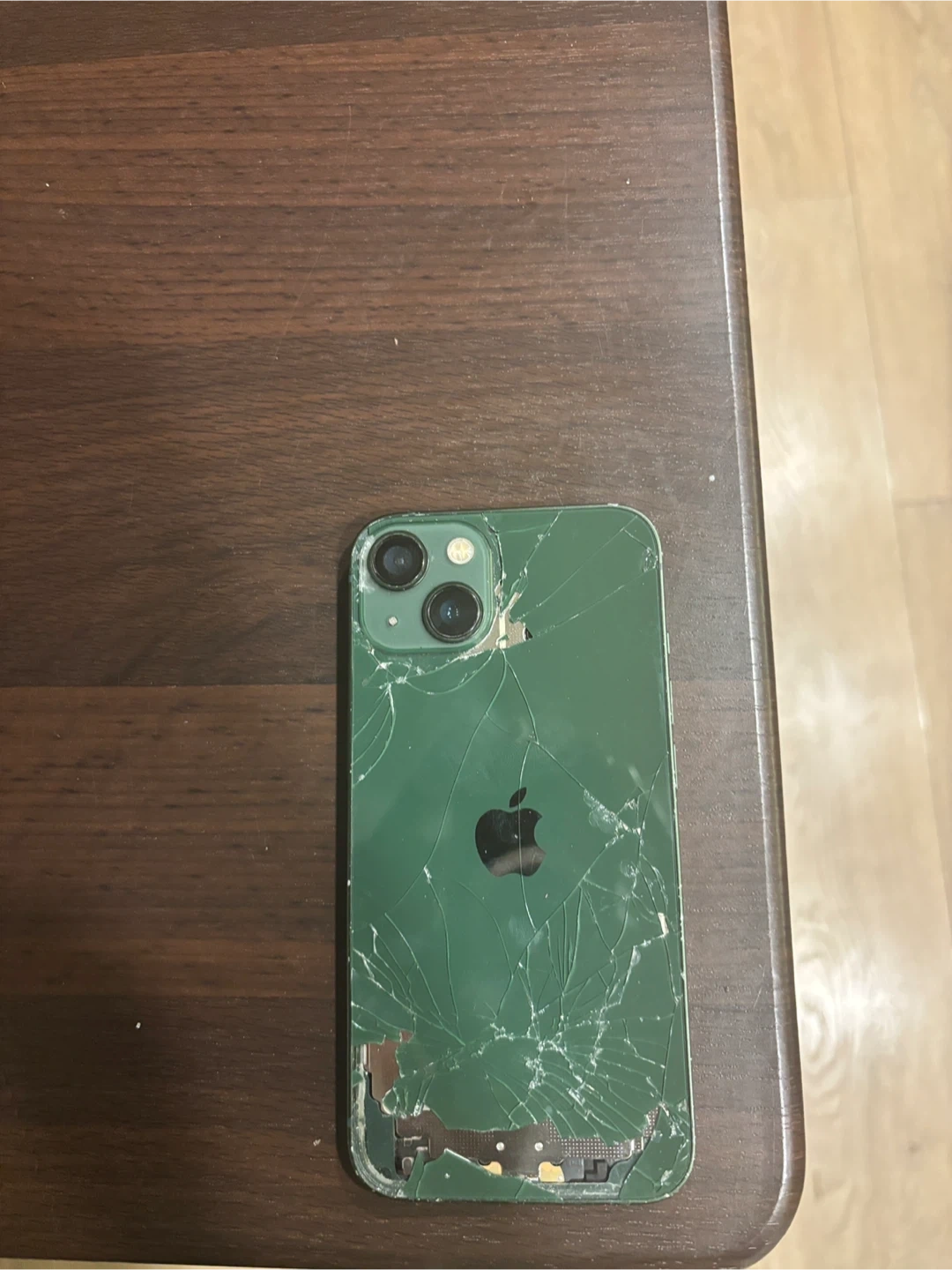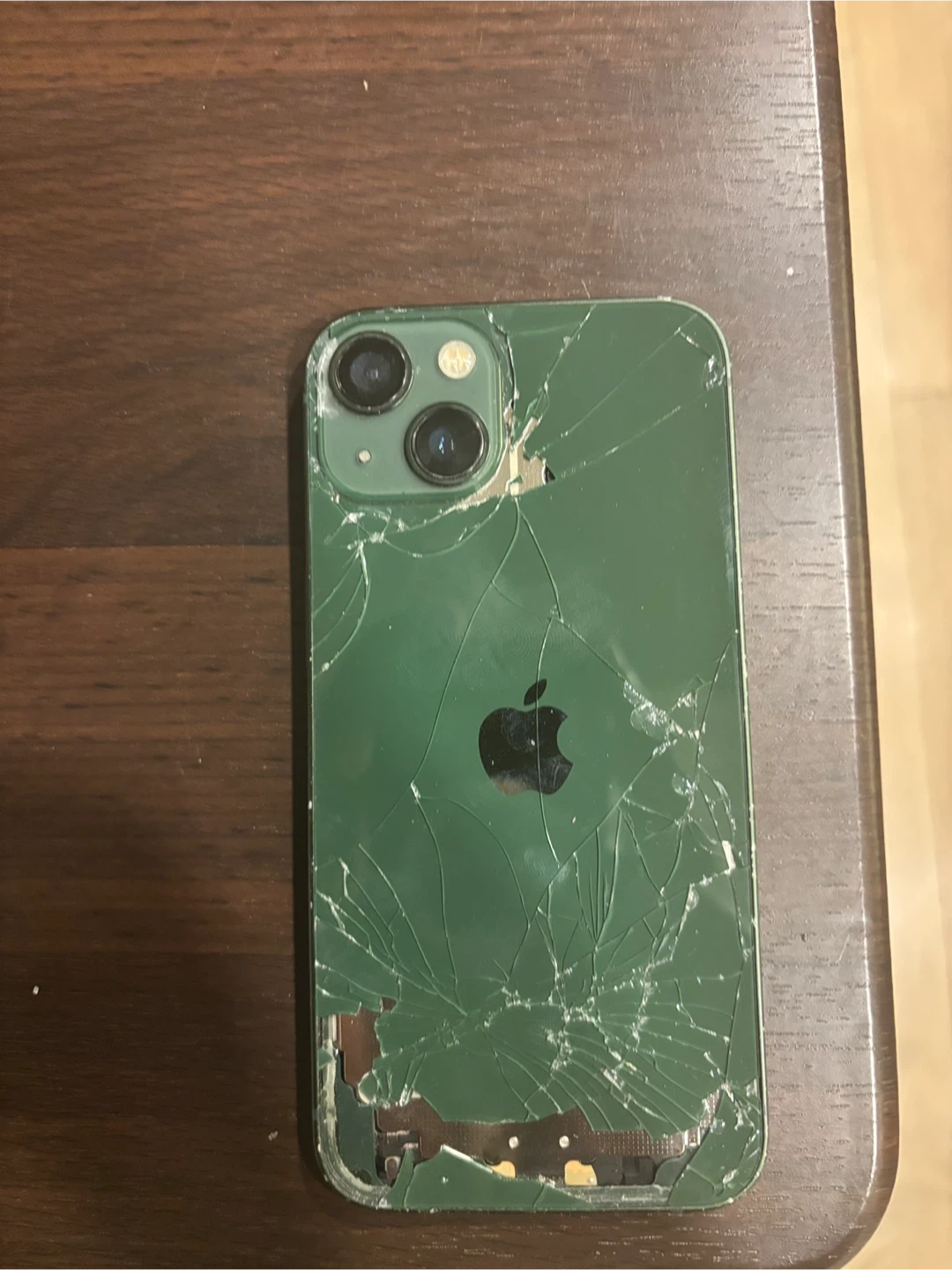 This is a green iPhone 13. The screen and back glass are significantly cracked and damaged. It appears to be for parts or repair only. It's a great candidate for someone looking to salvage components or practice phone repair!