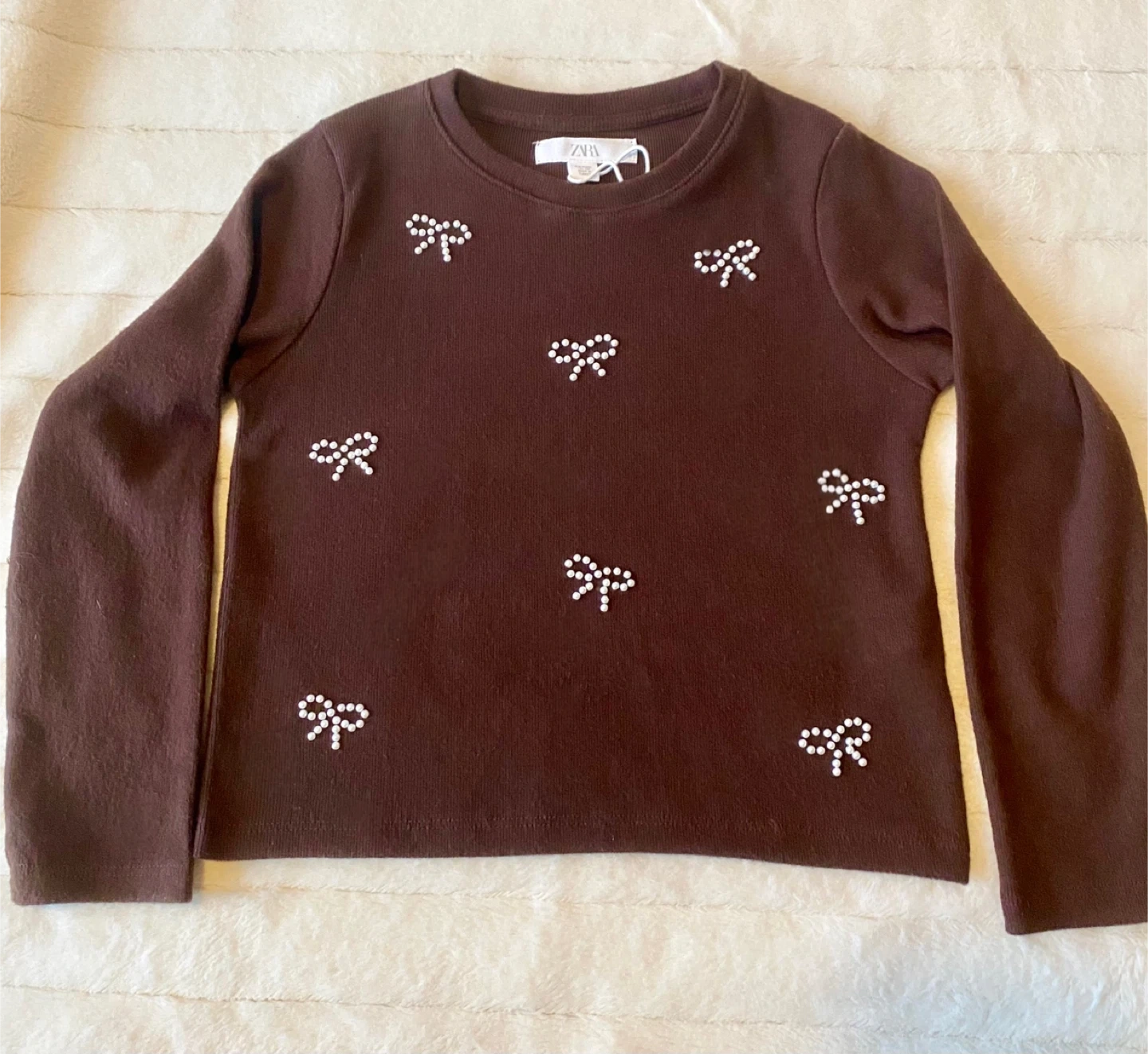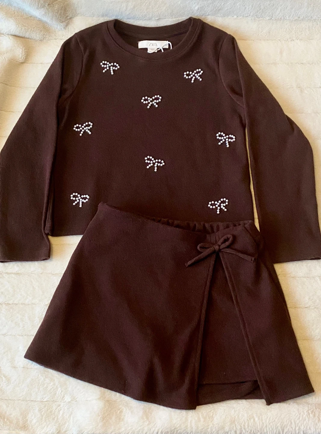 NEW! ZARA Girls Brown Pearl Bow Knit Sweater & Skort
