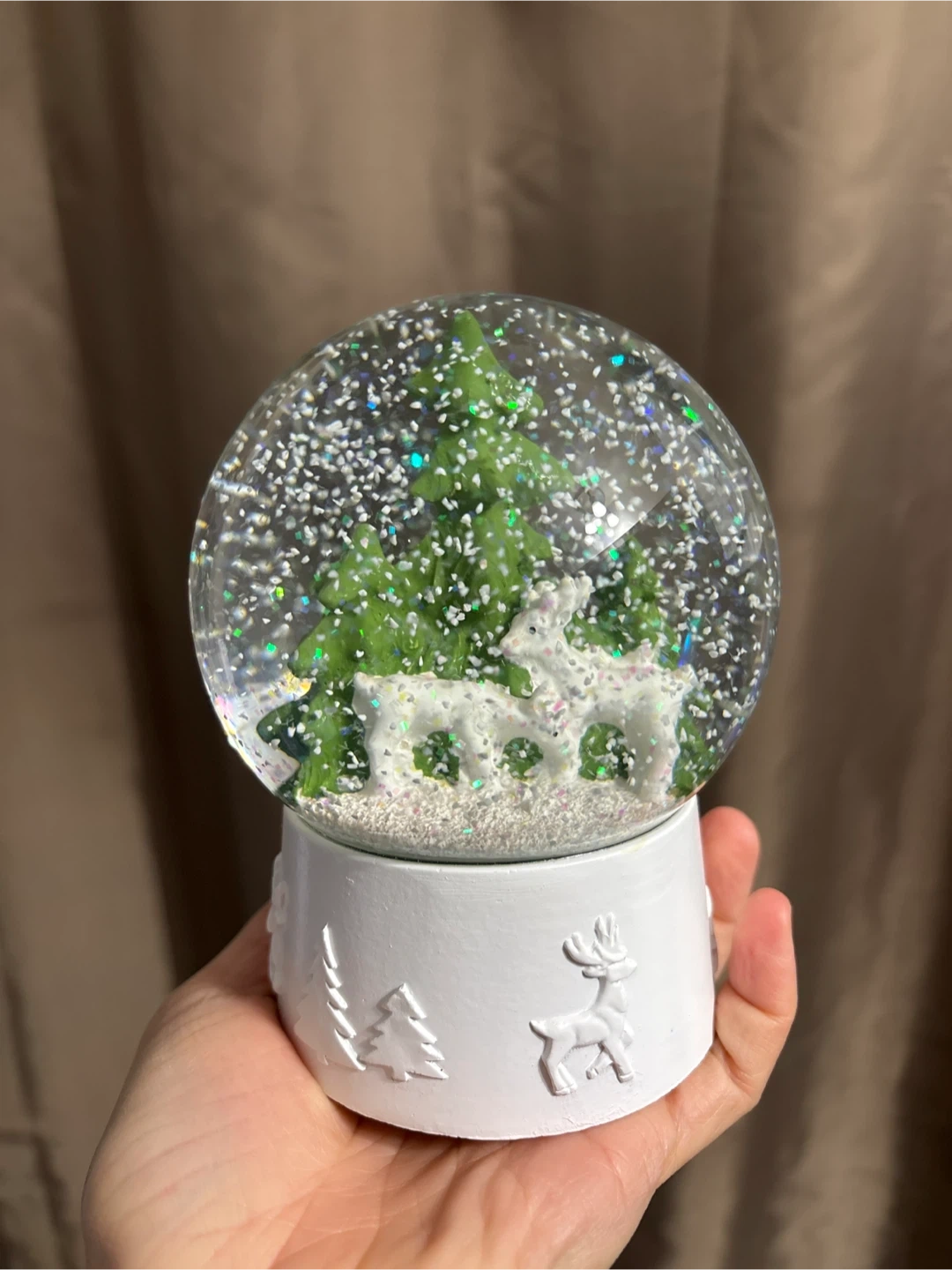 This festive snow globe features a charming Christmas scene with green trees and white reindeer. When shaken, it's filled with sparkling glitter. The white base has embossed wintery designs. Perfect for adding a touch of holiday cheer to your home! Porch pickup.