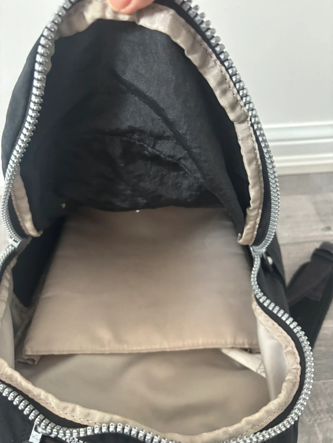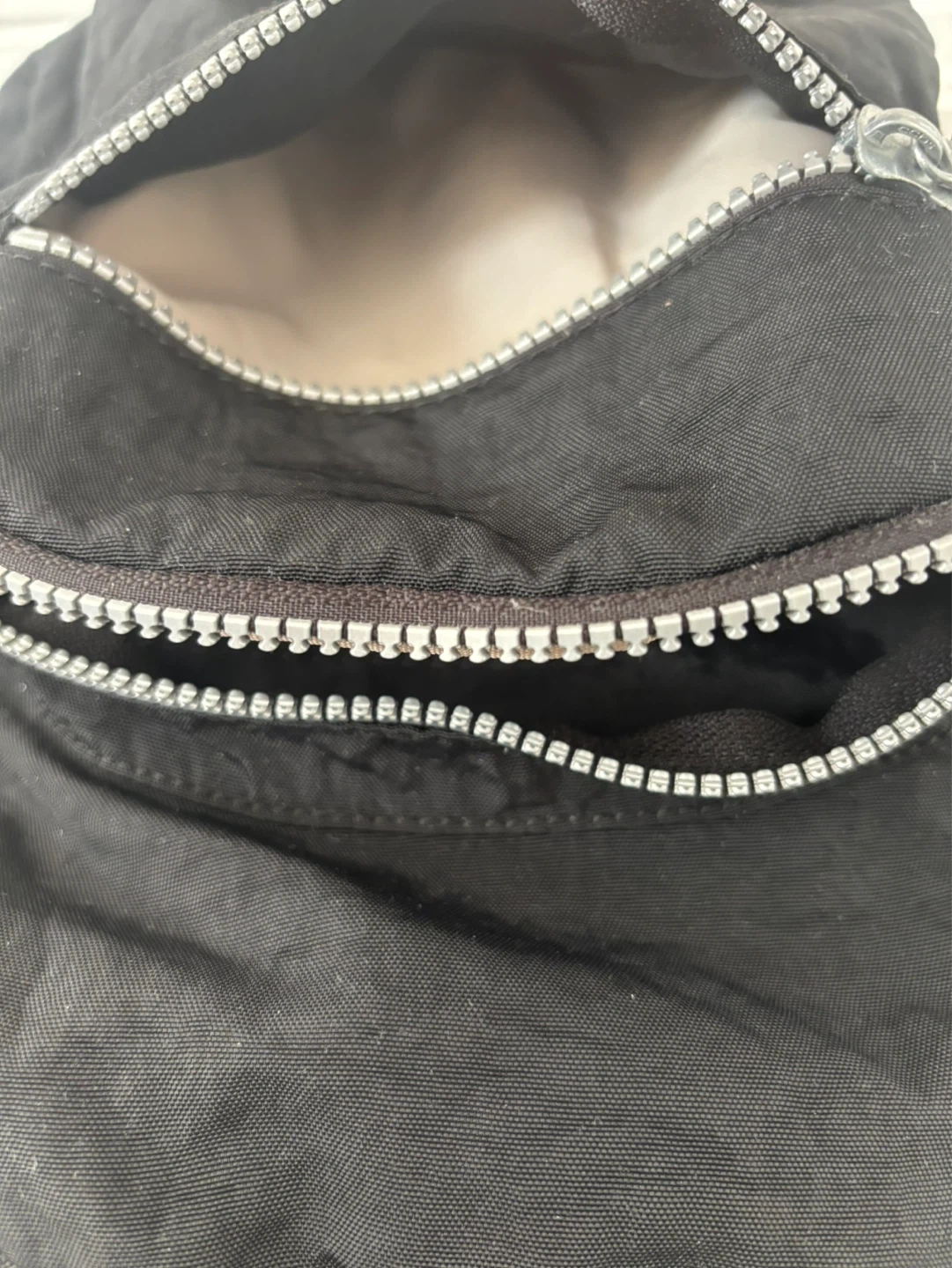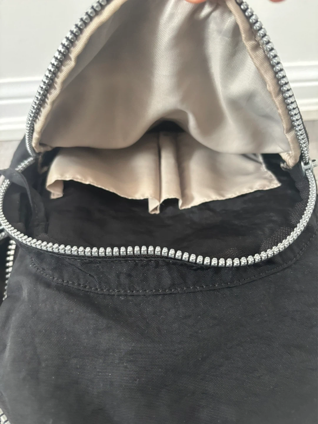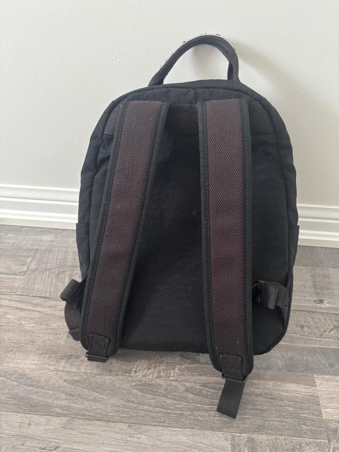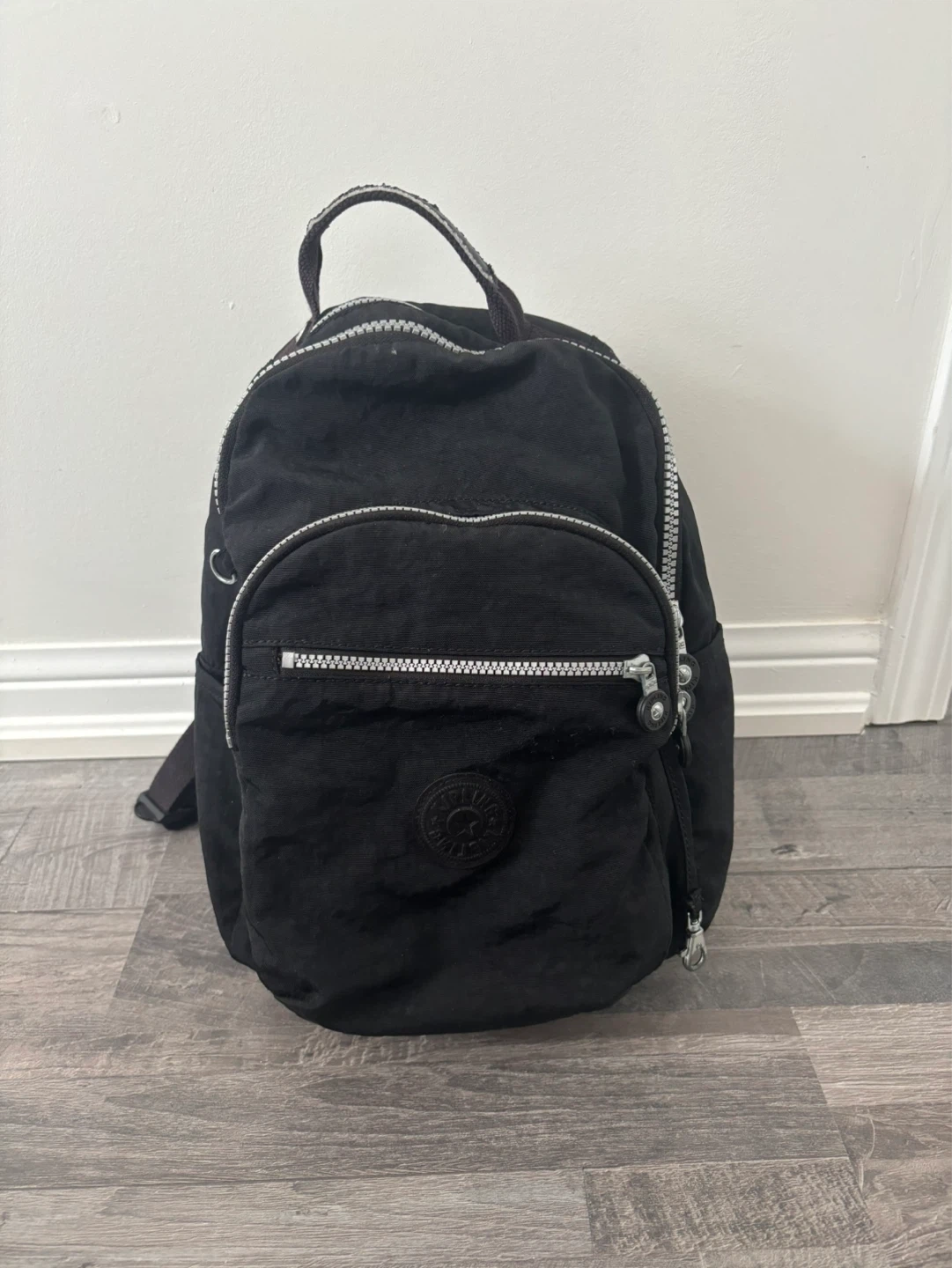 This is a Kipling black backpack. It's made of nylon material and features multiple zippered compartments. It's great for everyday use!