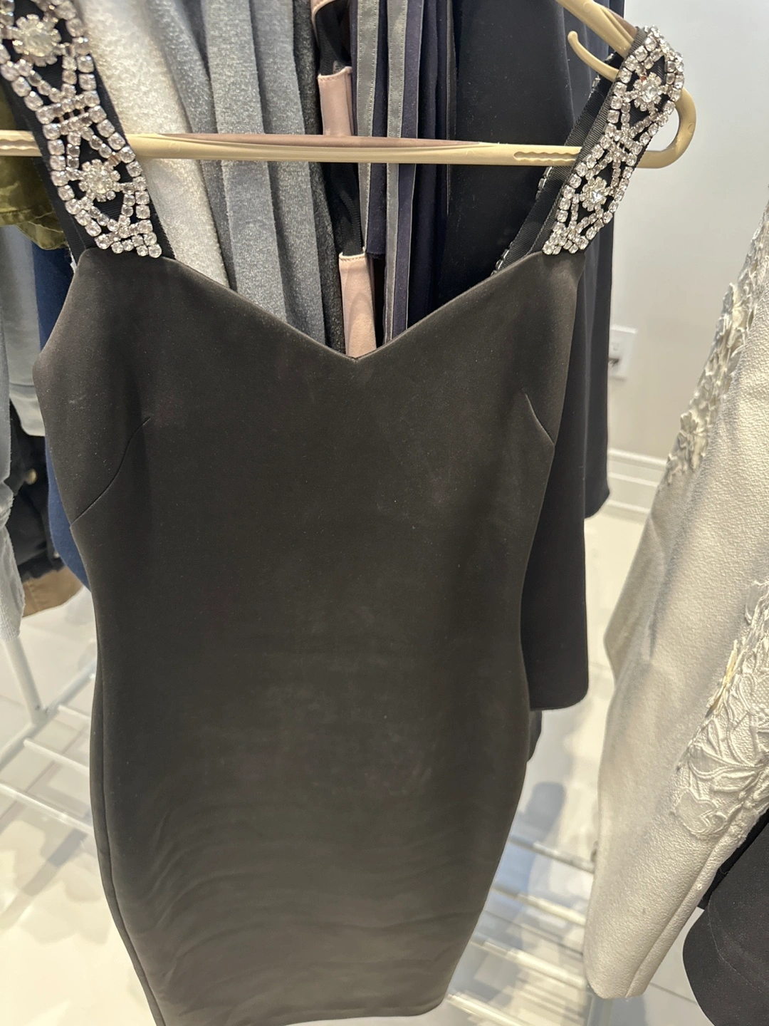 Stunning black mini dress. Features a sweetheart neckline and rhinestone straps. Close-fitting silhouette. Perfect for a special occasion.