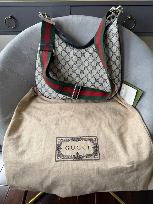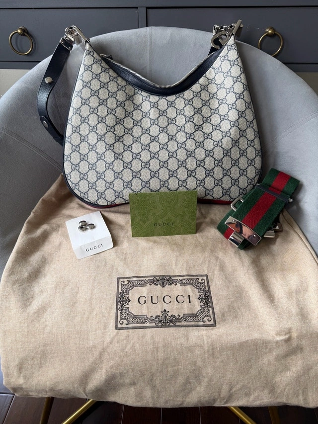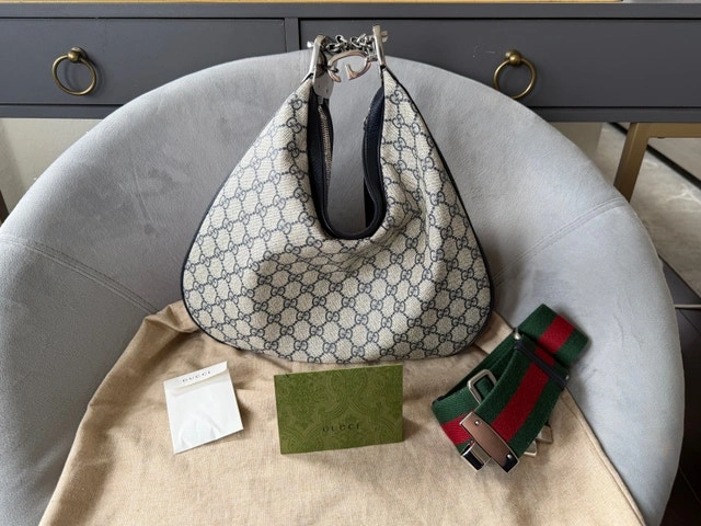 For sale is a Gucci Attaché Shoulder bag. In amazing condition, barely used. Purchased in Italy in 2023. Original receipt available to see. The bag comes with two (2) changeable shoulder straps, extra snap pins for the leather strap, and the original dust bag. The purse currently retails for $2,800 + tax. It's a versatile fashion statement with multiple wearing styles, offering great value!