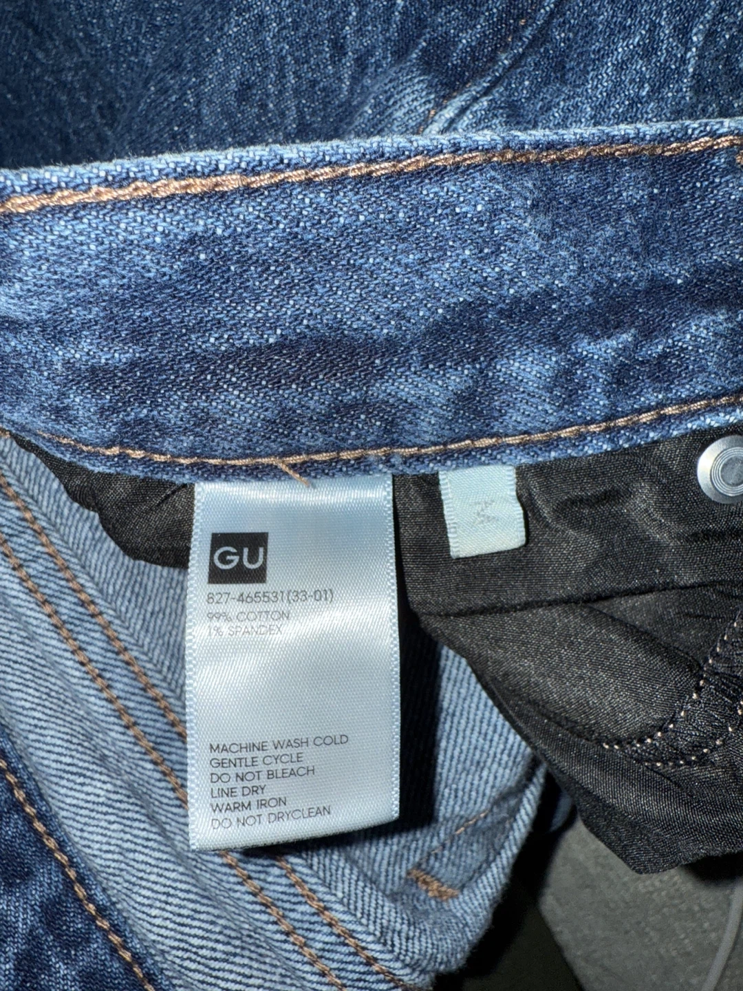 These GU jeans are made from a blend of 99% cotton and 1% spandex. They're a dark wash denim. Machine wash cold on a gentle cycle. Do not bleach, line dry, warm iron, do not dryclean.