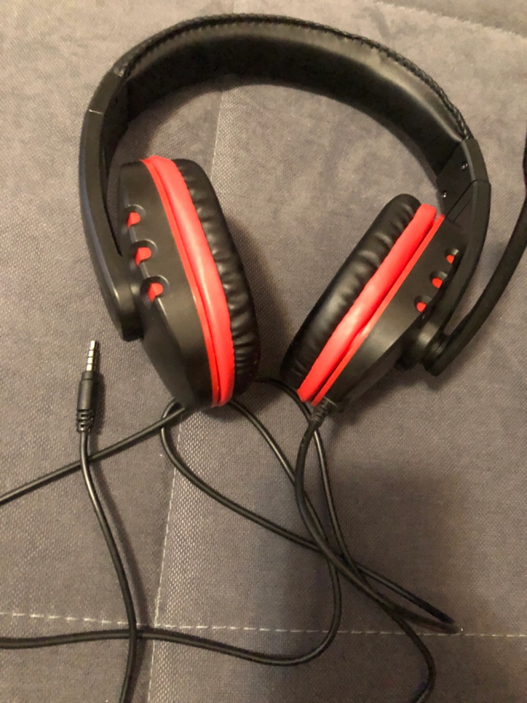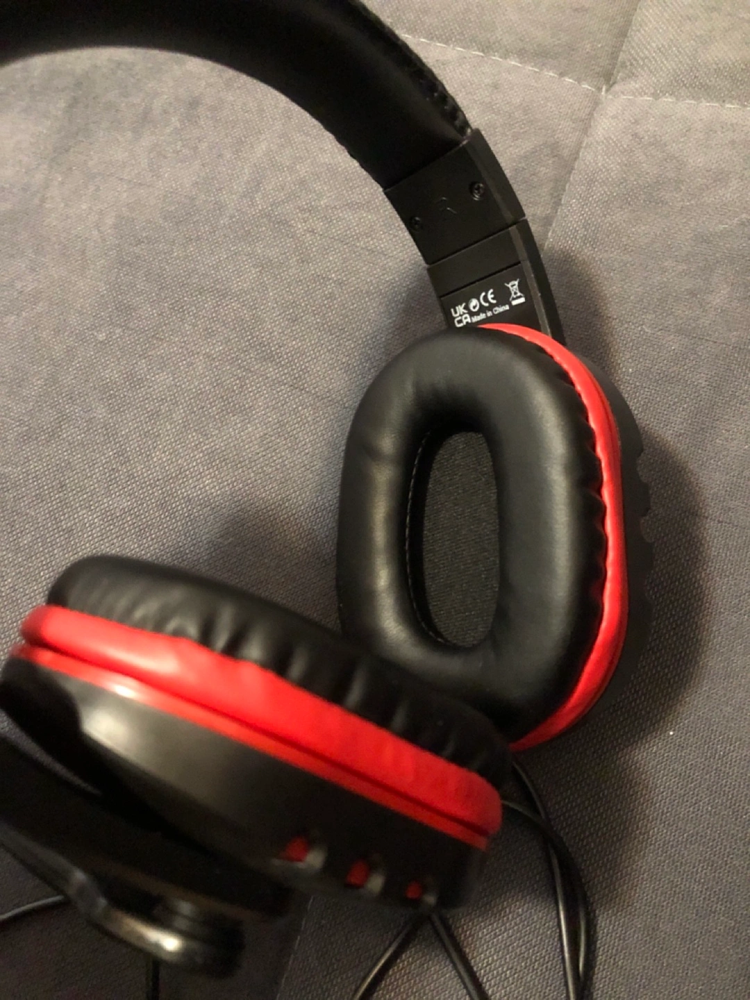 Over-ear headphones with a wired connection. Black and red colour scheme. Comfortable earcups. Suitable for gaming and general use.