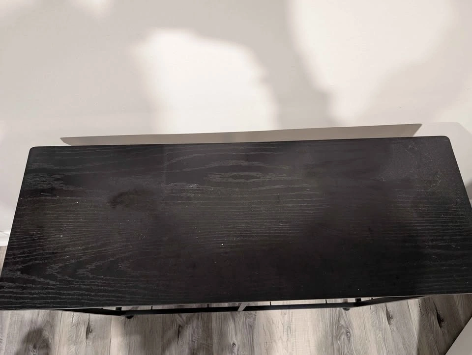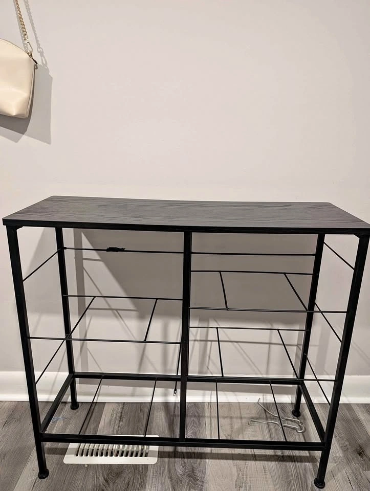 Stylish black console table with a dark wood grain top and black metal frame. Open shelving design for easy storage. Holds 5 shelving boxes.