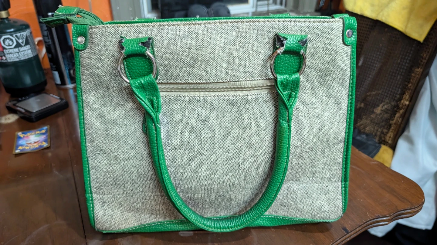 Stylish green and grey handbag from Hermes Paris. It's made with a textured fabric and leather accents. This bag features a zippered main compartment and durable handles. Replica