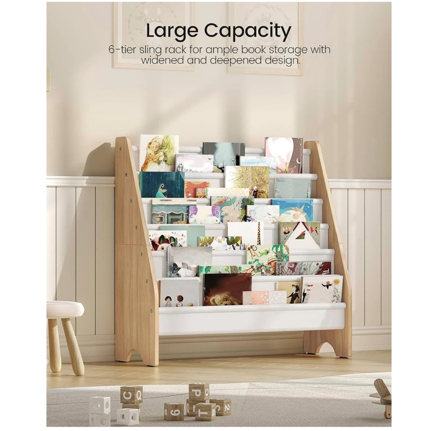 This 6-tier sling book rack offers ample book storage with a widened and deepened design. It's 75cm high, 75cm wide, and 28.5cm deep, perfect for organizing children's books. Keeps books tidy and accessible for little ones!