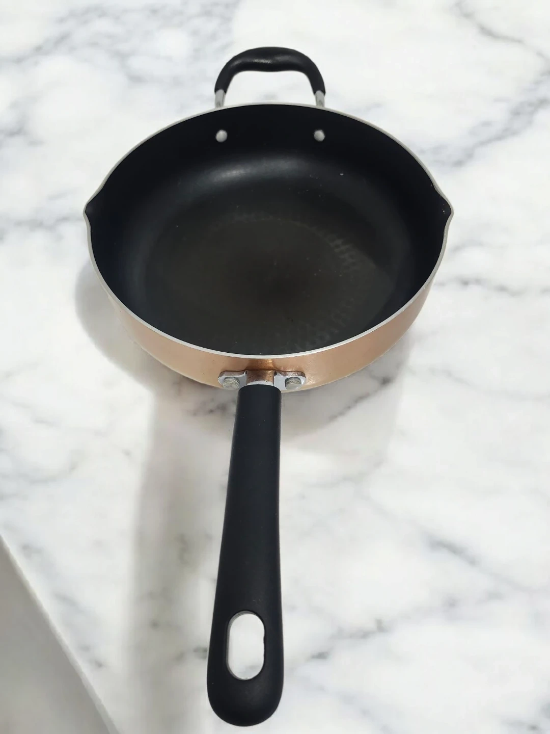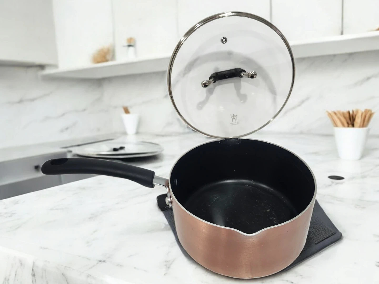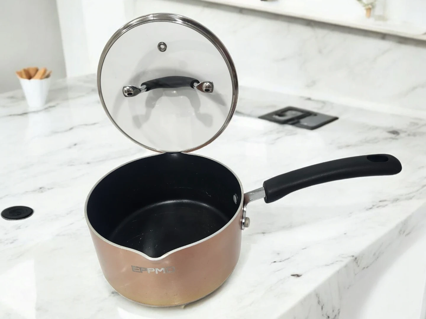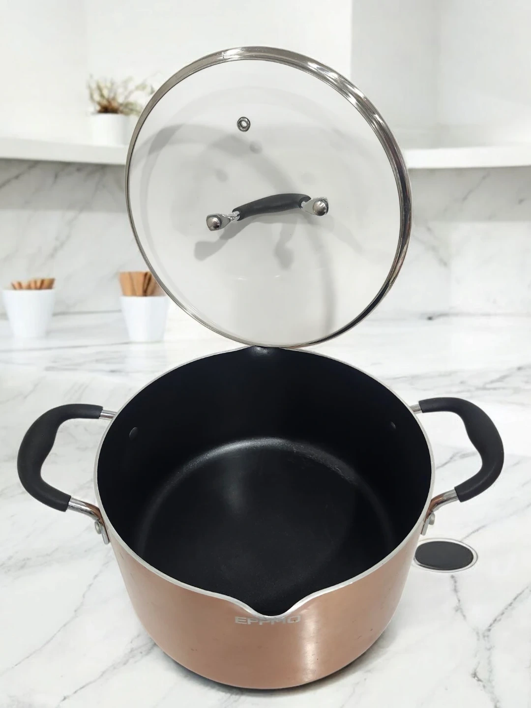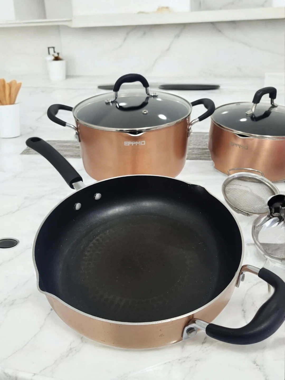 This cookware set features a beautiful copper finish. It includes pots, pans, and a frying pan with glass lids. It's suitable for everyday cooking tasks. The set comes with a strainer and an oven mitt too!