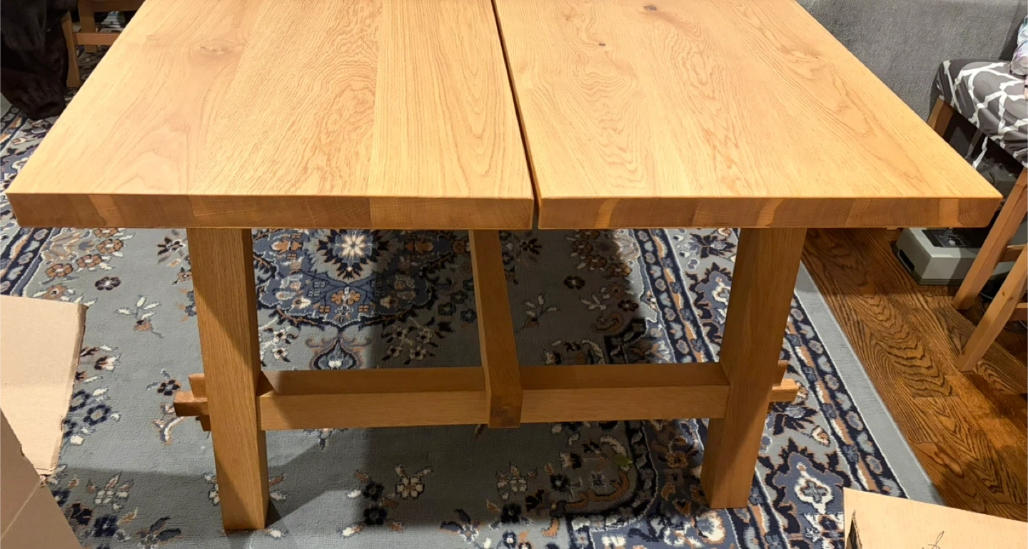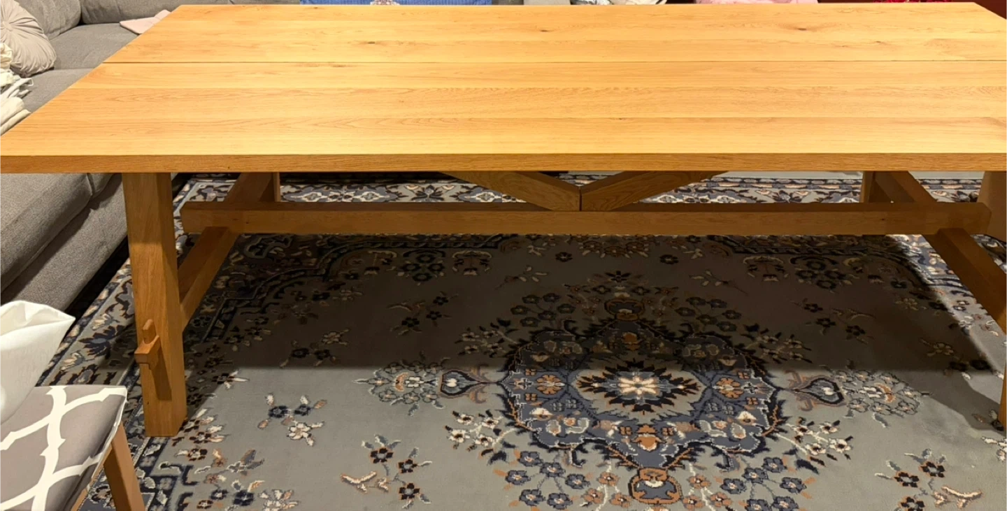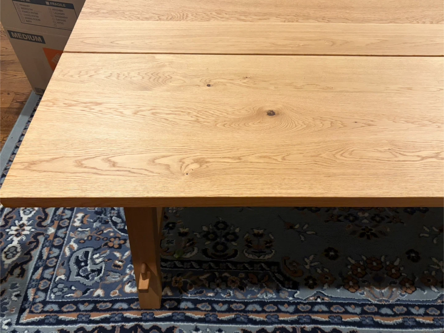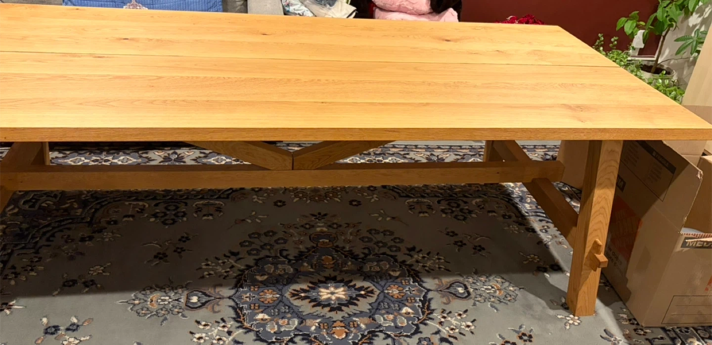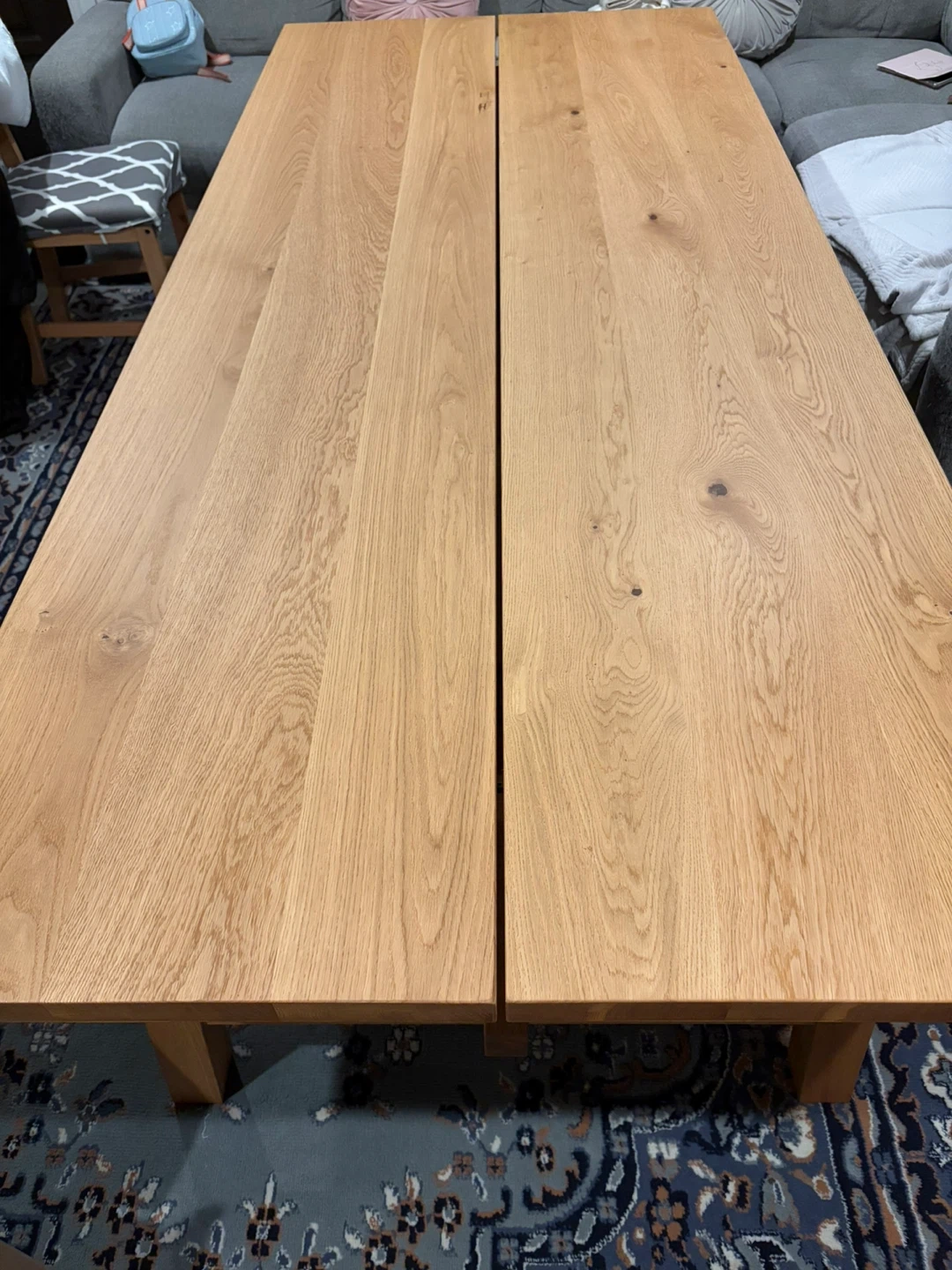 This is a solid oak dining table. It's made of natural wood with a simple, sturdy design. The tabletop consists of two planks. It's a great size for family meals!